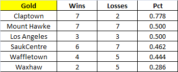 Port Ruppert took five of seven from Bushwood to eliminate the Caddies from crown contention. The teams do not play until the final three games of the PT season in Glorious Mundy Stadium. In the parallel crown chase, the Doug Outs and Auckland Athletics did not play, so Doug held on to the top spot. The teams meet three times in August before squaring off for seven games in September. They will also close out the PT season against each other, as the Athletics invade the Out House for the final three games in October.