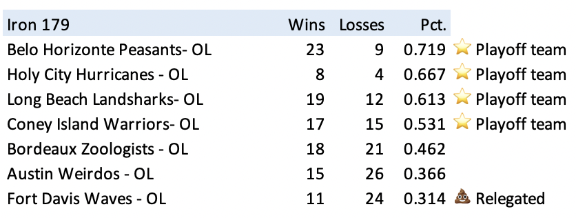 one miss at bronze (SaukCentre), otherwise got everyone in the right spot. Stone=2 teams Iron= 7 teams Bronze= 9 teams (8 one league, 1 in another) Silver=5 teams Gold=8 teams Diamond=5 teams |
