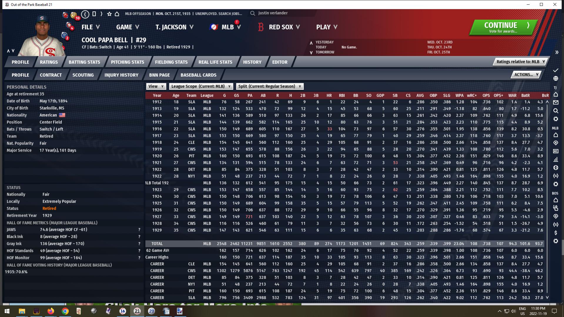 Cool Papa Bell showed up in the OOTP21 game. Spectacular defender. Was able to take Joe Black back to age 18, rather than 28, as he was when he started with Brooklyn, in 1952. Not a HoFer, but a damn fine career nonetheless.