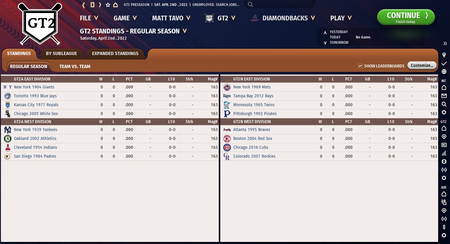 GT Premier League: Division Winners: 1986 Mets, 1975 Reds, 1927 Yankees, 1995 Indians Relegated to Tier 2: 1933 Senators, 1921 Yankees, 2015 Blue Jays, 1989 A's World Series: 1927 Yankees over 1986 Mets AL MVP: '70 Frank Robinson NL MVP: '27 Babe Ruth AL Cy Young: '01 Randy Johnson NL Cy Young: '29 Lefty Grove GT2 League: Division Winners: 1977 Royals, 1939 Yankees, 1965 Twins, 1995 Braves Relegated to Tier 3: 2005 White Sox, 1984 Padres, 1902 Pirates, 2007 Rockies World Series: 1965 Twins over 1977 Royals AL MVP: '77 George Brett NL MVP: '65 Harmon Killebrew AL Cy Young: '04 Christy Mathewson NL Cy Young: '69 Nolan Ryan GT3 League: Division Winners: 1924 Senators, 1953 Yankees, 1998 Yankees, 2011 Phillies Relegated to Tier 4: 1909 Pirates, 1909 Tigers, 1957 Braves, 2002 Angels World Series: 1953 Yankees over 1998 Yankees AL MVP: '54 Willie Mays NL MVP: '57 Hank Aaron AL Cy Young: '24 Walter Johnson NL Cy Young: '06 Mordecai Brown GT4 League: Division Winners: 2001 Mariners, 1983 Orioles, 2018 Red Sox, 1912 Red Sox Relegated from the majors!: 1985 Yankees, 1919 Reds, 2019 Nationals, 1978 Yankees World Series: 2001 Mariners over 2018 Red Sox AL MVP: '98 Jeff Bagwell NL MVP: '78 Reggie Jackson AL Cy Young: '17 Eddie Cicotte NL Cy Young: '11 Eddie Plank |