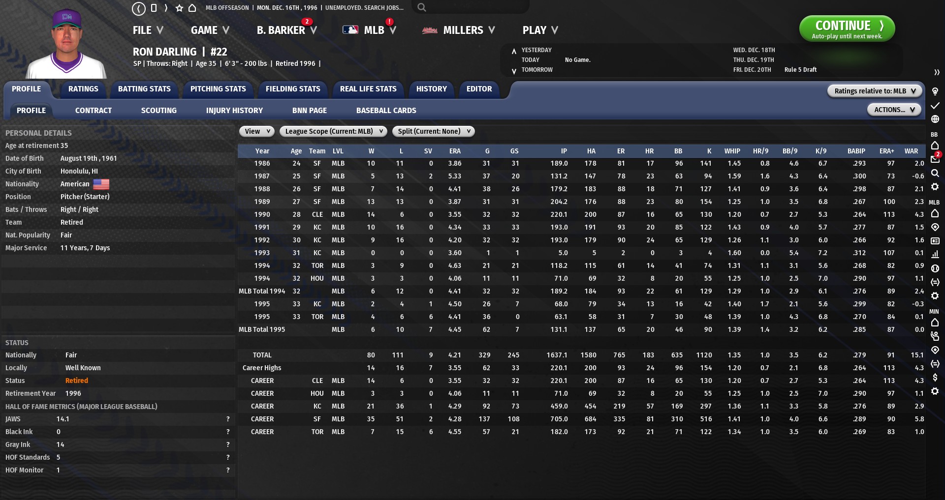 73 .300+ AVG seasons 16 .400+ OBP seasons 25 .500+ SLG seasons 18 .900+ OPS seasons 26 100+ R seasons 5 200+ H seasons 19 40+ 2B seasons 30 10+ 3B seasons 12 30+ HR seasons 24 100+ RBI seasons 50 40+ SB seasons 25 100+ BB seasons 92 5+ WAR seasons For pitchers: 57 sub-3.00 ERA seasons 6 20+ W seasons 4 40+ SV seasons 13 34+ GS seasons (significant because of "Strict" Rotation Mode setting) 12 15+ CG seasons 8 5+ SHO seasons 56 250+ IP seasons 14 200+ K seasons 27 sub-2.0 BB/9 seasons 28 7.0+ K/9 seasons No sub-1.00 WHIP seasons yet...Closest is 1.03 No sub-.200 AVG seasons yet...Closest is .201 Too many sub-.300 OBP seasons to count 4 sub-.300 SLG seasons 13 sub-.600 OPS seasons 56 5.0+ WAR seasons (I prefer rWAR, but they don't track it) |