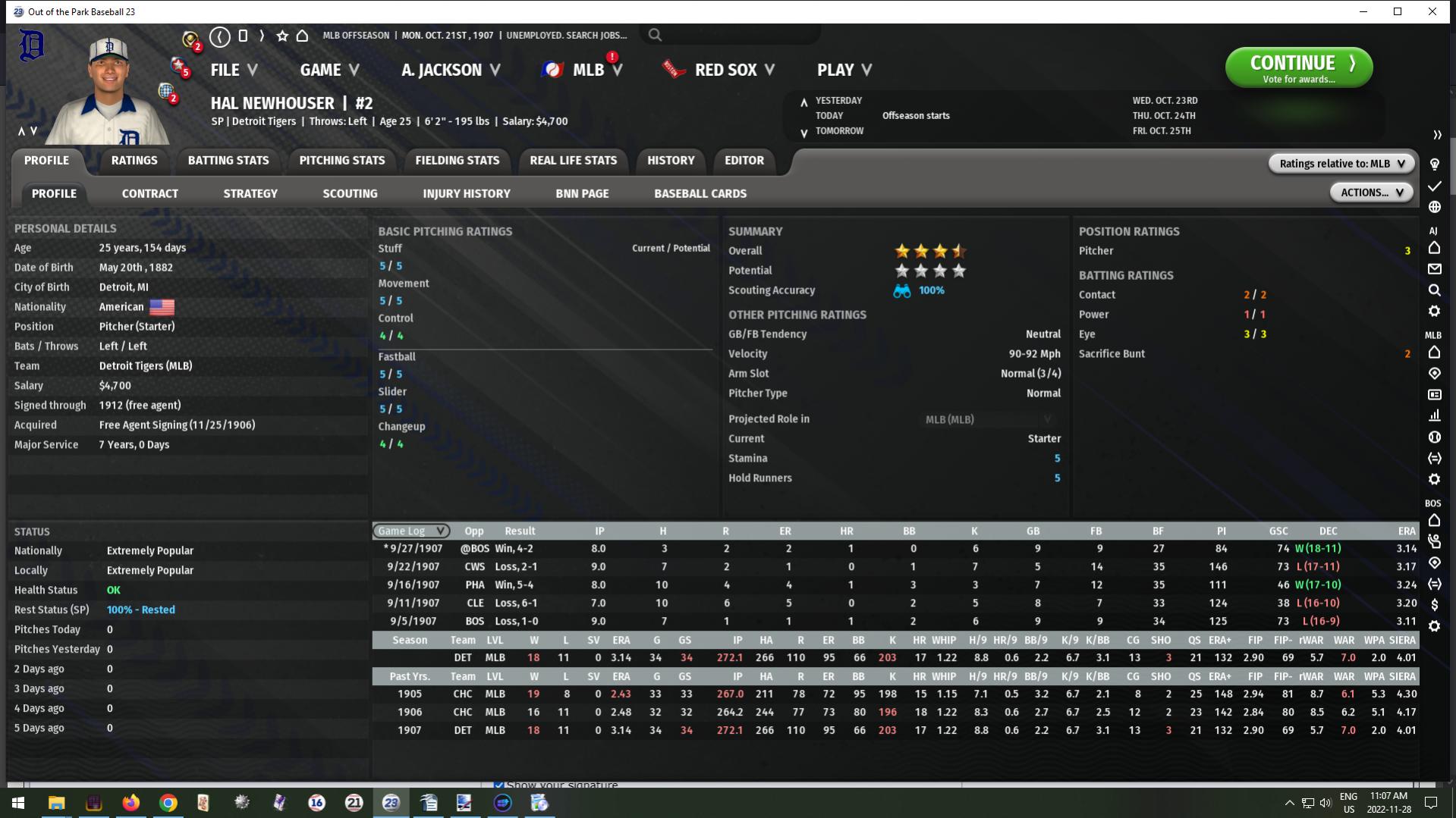 N.B.: I now turn off Real Life Splits, because so many guys from 1871 through 2021 are not in that file. That will give guys who are much stronger against one side, a leg up on the competition. It's either that, or use the splits from 40ish years of ball, while ignoring the 110 years that aren't available, yet. Those splits may make it into OOTP24, but as of right now, they only go back to 1981. Frank Thomas v2.0, 1990, 156 Billy Hamilton v1.0, 1888, 141 Ross Barnes, 1871, 167 Trevor Story, 2016, 112 Pete Reiser, 1940, 128 Mike Schmidt, 1972, 148 Cesar Cedeno, 1970, 123 Barry Bonds, 1986, 182 Ellis Burks, 1987, 126 Carl Yastrzemski, 1961, 130 Willie Stargell, 1962, 147 Smoky Joe Wood, 1908, 110 Bibb Falk, 1920, 113 Ed Morgan, 1928, 119 Gene Tenace, 1969, 136 Steven Souza Jr., 2014, 99 Eddie Bressoud, 1956, 96 Ken Singleton, 1970, 132 Shin-Soo Choo, 2005, 122 Len Koenecke, 1932, 124 Mickey Mantle, 1951, 172 Nick Castellanos, 2013, 116 Tom York, 1871, 119 Brian Giles v2.0, 1995, 137 Dusty Baker, 1968, 116 Wally Moon, 1954, 118 Rafael Devers, 2017, 120 Harmon Killebrew, 1954, 143 Tyler Naquin, 2016, 102 Sammy Sosa, 1989, 128 Jake Wood, 1961, 83 Scott Rolen, 1996, 122 Andre Thornton, 1973, 123 Caveat: The Inaugural Draft thing changes some of these figures, depending on when guys came in. I'll take that into account, with what the player did IRL from his debut in my game forward. I won't do it for guys that came in after 1901, because they'll be their age at debut, or one year younger. Don't ask me why, but RD brings these guys in to debut a year before they really did. I don't mind, really. Gives the dominant ones a chance to be even better. Some guys showed up in the Inaugural at their debut age, or sooner, so there's no need to look at them, either. Thomas same Hamilton same Barnes, 1874, 151 Story, 2017, 110 Reiser same Schmidt, 1979, 153 Cedeno same Bonds, 1992, 200 Burks, 1993, 132 Yaz same Stargell, 1977, 140 SJ. Wood, 1911, 113 Falk, 1923, 118 Morgan same Tenace, 1977, 135 Souza Jr. same Bressoud same Singleton same Choo same Koenecke same Mantle, 1968, 143 Castellanos same York, 1872, 119 Giles, 1996, 136 Baker, 1973, 115 Moon, 1960, 116 Devers same Killebrew, 1963, 145 Naquin same Sosa, 2001, 138 J. Wood same Rolen, 1997, 122 Thornton, 1975, 123 There are three 19th century guys in here. The vast majority are 20th century guys, with a few 21st century guys sprinkled in. The vast majority of these guys should be hitting well. Souza Jr., Bressoud, Jake Wood, and Naquin made me do a double take, but I don't have much of a problem with the other 29. Story's a tough nut to crack, because we don't know how much the OPS+ category is punishing him, for playing all of his home games in Coors Field (remember the RL Stats only run through 2021). Smoky Joe Wood slightly preceded Babe Ruth IRL, in the two way player category. Dude's a freakshow. For the most part, we're looking at hitters that should be making leaderboards. I don't think many of these will last too long, as the game goes forward, but who knows? Maybe the offensive environment will pick up a bit, too. The latest draft is very pitcher heavy, without much in the way of position player strength, so it may be a while yet. It's not as off as you or I thought it was, but it does seem a bit different from past versions. Different in the fact that reeeally good hitters are getting smacked down, while "interesting cases" are emerging out of nowhere. Some of that can also be put down to development taking over for recalc, and creating a monster. I have no idea why Pujols has been pummelled in both of our games, so far. I had Leo Kavanagh, and Tillie Shafer emerge as superstars in 16, while Griffey Jr., and Kershaw weren't their usual dominant selves, so this kind of voodoo's been around, even during versions that we felt were more "accurate". I'm beginning to wonder if Player Development isn't a much stronger force, within seasons now, than it has been in the past. That could explain a few of our flops with RL studs. The new setting there makes me think that might be our Huckleberry, but this game has so many moving parts now, that it's difficult to put a finger on a single factor. |