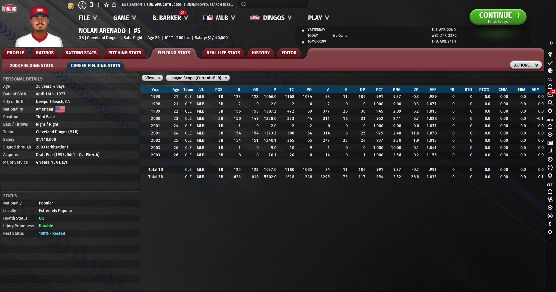 My game: .255/.318/.378/.696, 4.19 R/G (a hair under 4.20), 3.74 ERA I don't mind the hitting averages being off. The run scoring environment is what counts for me, and that's dang near perfect. The spread across individual players is what's lacking, but I'm fine with the league wide numbers. More than fine actually. There's not as much separation between the really good players, and the not so good ones, but that should work itself out. Something's tightened up in this version, and it's good to see. I've even loosened my stance on league BABIP. I used to dial it down to the RL number (.286), but even the game's number (.289), doesn't really cause crazy ball. We'll see what happens once the Inaugural Draft guys have passed through. |