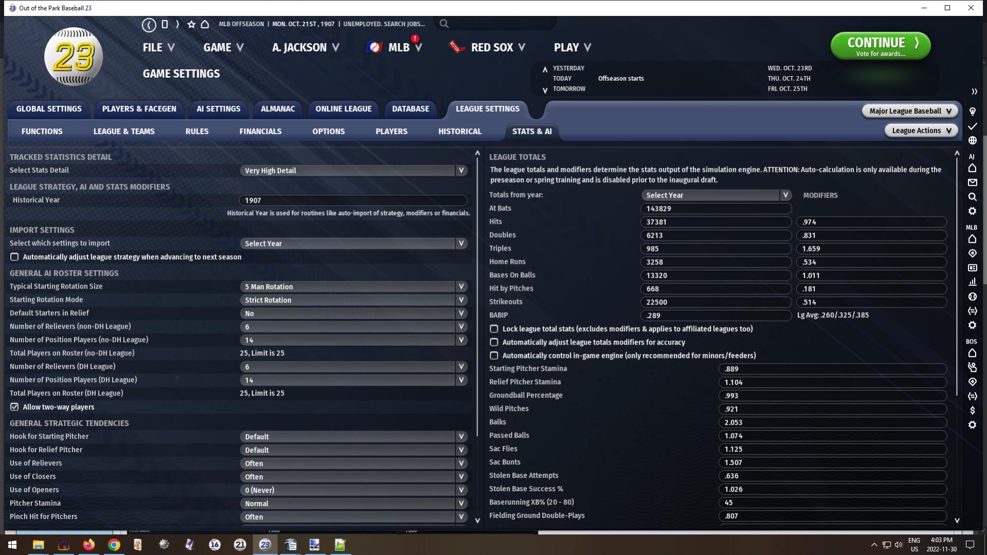 Oof. This one's a doozy. Are you trying to replicate the output of a certain season, or do you want that feature automated? Looks like you've got that box checked, so I'm gonna assume automated. You can also do it manually, by merely selecting the year, and the AI will fill in the modifier settings that it will use to try and reach the league totals that you're hoping to reach.