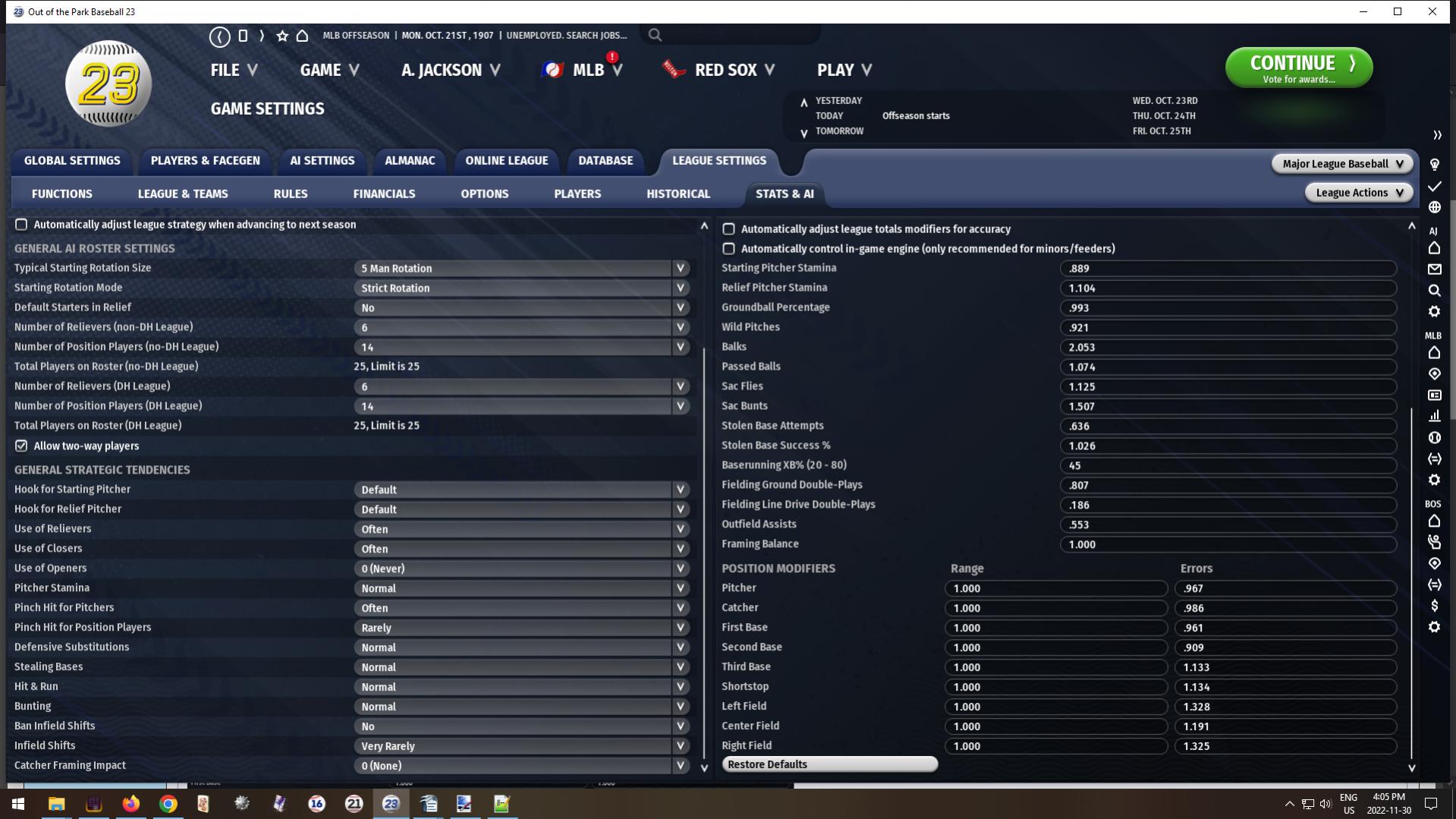 The total_modifiers and total_modifiers_neutralized text files in the default database folder should be what I need. But the numbers that OOTP 23 imports never match these, and the categories of the numbers are not labeled in the database text files. I have attached a screenshot of the numbers I need to find for each historical season. Should I use the total_modifiers or total_modifiers_neutralized files (depending on whether I'm using neutralized stats), so I can manually enter the correct numbers and work around this bug? There are 40 total modifiers on this screen, and there are 40 numbers for each season in the total_modifiers and total_modifiers_neutralized text files (screenshot of this attached). Hopefully I can use one of those. But I want to be sure these files are still valid, and I want to make sure that I enter the numbers in the right sequence. I'm assuming that the numbers in the text files follow the sequence on the screen, with numbers for boxes under the Errors column entered last. Last edited by Charlie Hough; 11-30-2022 at 04:56 PM. |