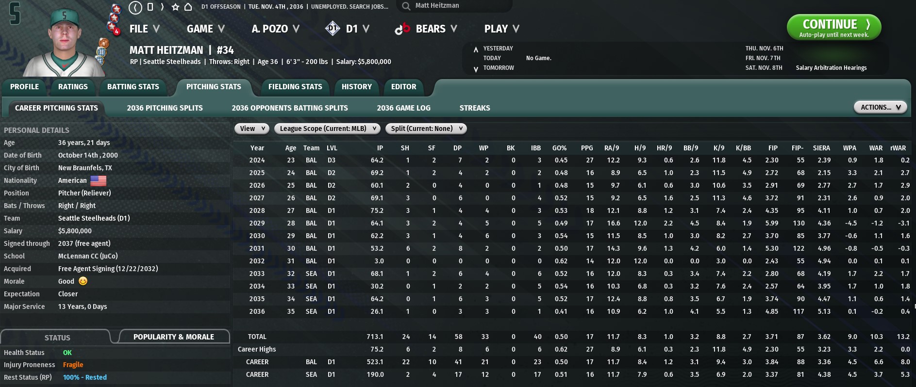 It’s Saturday, October 11, 2025, the second to last day of the 2025 NABF season, and there are four games on today. At 1pm, you watch Game 6 of the Division 4 Championship series; it’s been a good one, with the Albuquerque Dukes leading the Charlotte Hornets three games to 2. It’s a tight contest through 7, but now the Dukes have the bases loaded, though they’re a run back of Charlotte. There are two outs, but the light-hitting shortstop Steve Willis is up; he’s only had two singles during the series and has struck out 7 times. The count runs to 2-2. Then, a fastball, away. Willis lunges and manages a bloop down the line - it’s fair! It bangs against the corner where the wall juts out and scoots just far enough to elude Charlotte LF Xenophon Korkoris. With one run already in, the runner at second is now being waved around - with two outs, he’d been off on contact, and now he dives, his hand sweeps over the plate as the tag comes in, and he’s safe! Albuquerque has taken the lead! They score twice more that inning, and it’s sewn up - Albuquerque takes the title in six. You flip over just in time to catch the 4pm first pitch for Division 3’s Game 7. Another tight contest - this one a smashfest. You didn’t really have a rooting interest in D4’s ALB-CHR, but this one has a David and Goliath feel to it: The Padres are looking for their fifth Championship, and second straight after promotion from Division 4 in the offseason, while Ottawa - long one of the most hapless teams in the Federation - is here for the first time. You like an underdog, and they’re certainly that, but at the moment it doesn’t look great - after a few lead changes and almost as many pitching changes, San Diego is up by two heading into the ninth. We’re in Ottawa, though, so when ace Champions reliever Doug Klutz wraps up a scoreless top half, Ottawa’s top of the order comes due. Ottawa got here through pitching and defense, but they’ve turned on the power so far this series, so it feels like there’s a chance. When CF Nick Washington leads off the bottom half with a solo shot, the Ottawa crowd erupts, and no one sits down for the rest of the game. #2 hitter Herb Phillips Ks, and Frank Flanigan grounds sharply to third, but then the great Josh Randall steps to the plate. Randall signed with Ottawa in the offseason, as good a place as any to end a career, and then he found himself along for the ride. Randall has never won a Championship, and he wants it bad - he lines a single to the opposite field. Another single, this time from the speedy young 2B Lorenzo Escobar, and suddenly Ottawa has the winning run on first. Randall is lifted for a pinch runner as Josh Henry comes to bat. Henry is just 25, and didn’t even play a full season for the Champs, but was electric in the second half, and the crowd senses it. Henry doesn’t make them wait, turning on the first pitch and sending deep, into the RF corner - it misses a homer by inches and rolls toward the right fielder Gonzalez. One run is already in, and Gonzalez comes up firing but it’s too late! Escobar crosses home standing up, into a pile of his teammates - the Champions are Champions, and in walk-off style! The exhilaration of that win almost makes you forget that the D2 Championship game 6 started at 7 - it’s already well into the third when you flip over. The Baltimore Terrapins had won an astonishing 115 games in 2025, easily the most in the Federation’s history, and their victory over Vancouver seemed an almost foregone conclusion, but they’d dropped the first game in Baltimore and had narrowly won the second. The Mounties crushed Danny Rzasa in Game 3, but the Pins came back to take the 4th and 5th, and now stood on the precipice of becoming the first team with championships in three different Divisions… but as you tune in, you see a 5-0 Mounties lead, already. This time they’ve victimized Martinez, who was brilliant in Game 2 but is on the ropes here. The Mounties add two more in the 5th, and another in the 6th; a Steve Mauck solo shot eases the pain in the 7th, but not by much. The Division 1 game is starting up soon, and you figure you can flip back here and there - if the Pins come back somehow, you’ll catch it. They don’t, and you watch the Philadelphia A’s take all the drama out of their own Game 7, vanquishing El Paso 6-2 after a two homer performance by 1B Jake Haston - he hit two earlier in the series and is an easy selection as series MVP. You watch until he finishes his quick shoutouts, hoisting the MVP trophy while his teammate, the great catcher Corey Cerrone, holds the championship cup behind him. Then you switch it off and head to sleep. So now it’s October 12, and only one game remains between baseball and the offseason: a Division 2 game seven between the best regular season team in NABF history, and a Mounties club whose 94 wins are hardly nothing, but still pale in comparison to that juggernaut. Or so people have said, anyway: here they are, now, one win away from an upset victory over a superteam. And it’s Rzasa, again: he’d had a terrible Game 3, which, if repeated, could mean a long offseason in Baltimore. Rzasa hadn’t lasted past the second inning in Game 3, but in Game 7 he manages four plus before exiting, his Terrapins leading 6-4 after a Doug Padgett bases-clearing double in the third off promising young starter Danny Pierson. Philadelphia’s manager will take heat for starting the youngster in this series, you think. Padgett has given the Pins an extraordinary series so far, but once Rzasa left things have gone awry, and it looks like that effort might be wasted as Vancouver drops two on Baltimore’s pen in the seventh, tying it up. In the eighth, they finally get to David Linder, who has handcuffed them in four scattered innings over the rest of the series, and entering the ninth it’s 7-6 Vancouver. Baltimore closer Matt Heitzman sits Vancouver down in order, as he has all 