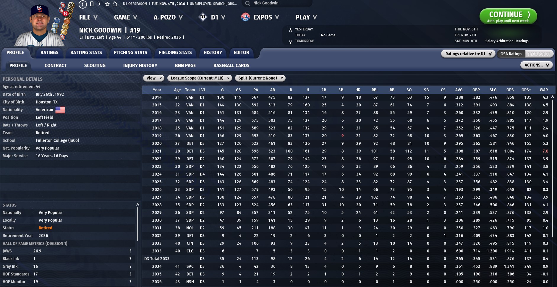 CF Benni Phillips, Toronto Maple Leafs, 2031 Phillips is probably the greatest of the current crop of NABF stars - a serviceable defensive CF with a complete offensive attack. He was the unquestioned best player in Division 2 over a four year stretch between 2030 and 2033, his age 24-27 seasons, during which he slugged 146 homers and put up 33.5 WAR while lifting his team back into Division 1. His numbers have taken a hit against better competition in D1 but he remains a dangerous hitter into his 30s for Toronto, whose uniform he will be wearing until 2041 after signing an 8 year extension in 2034. Phillips is a two-time MVP, winning his first in 2031 as he led the league with 174 hits, 105 runs, a .427 OBP, and a 9.7 WAR - a new single-season record for D2. Part of that value was his 39 homer total, at the time a career high, as he slugged .606 with a .331 BA. A complete offensive season, one of the best the NABF has seen. 3B Ali Brown, Detroit Stars, 2032 Brown has been one of the biggest drivers of the Sounds’ extraordinary success over the past six seasons, as they reversed years of futility that included four straight last place seasons and a drop from Division 2 down to Division 3. Brown, now a third base institution in Detroit, burst on to the scene in his first full season, putting up 8 WAR with a .284/.392/.563 line, that SLG being the best in D3. He hit 35 homers - he would dramatically improve on this in his nearly-as-good 2033 with 47 - while also posting a division-best .409 wOBA and winning the first of two MVP awards. His most recent 2036 season was also the best on a Detroit team that won the 2036 Championship, which means Brown will have his first shot at D2 competition in 2037. SS Mike Burcham, New York Giants, 2033 Burcham has emerged as the best of a new crop of star shortstops over the first years of the 2030s, helping his Giants toward competitiveness. The team has finished below second place only once in the decade, and in 2033 won the D1 East behind Burcham’s great season - the first time the club had won a Conference title since 2024, and its first in D1 since 2012. Burcham won both a Gold Glove and batting title in 2033, hitting .343/.411/.433 - that OBP also a league leader. His 202 hits, 10 triples, and 113 runs were also tops in D1, as was his 8.6 WAR. He followed up 2023 with another stellar campaign, breaking out with 65 stolen bases and adding some additional gap power (a league leading 41 doubles) but 2033 was his best season, and the one that best showcases his contact-speed style, an increasingly common one in D1 in the last few years. 1B Danny Gonzalez, Tijuana Potros, 2032 Few current stars are as decorated as Gonzalez, who has a Rookie of the Year, a Gold Glove, 9 Silver Sluggers, 11 All-Star selections, and two MVP trophies on the shelf at home to go along with a D1 Championship. Gonzalez had his best season in 2032, when he took home his second MVP while collecting the first of three recent Triple Crowns in the NABF (along with Clemens Young in 2035 and Carson Prince in 2036). He put up a .340/.404/.658 line with 48 homers and 137 RBI, also topping the Division with 7.6 WAR, 179 wRC+, and a .444 wOBA. C Mike Kepler, El Paso Sun Kings, 2036 Kepler’s overall line isn’t as impressive as those above, but his 2036 stands out for a singular reason: in 2036, Kepler became the first catcher to win an MVP in any Division in NABF history. Kepler’s age 27 season was the latest in a string of outstanding offensive seasons from behind the plate, and Kepler took a step forward in 2036, setting career highs in average and OBP (.318 and .399 respectively) while maintaining his power level with 20 homers and a .513 SLG. Though he didn’t lead his league in any offensive category, his 5.1 WAR at a demanding defensive position and on a championship team was enough to put him over the top in a tight MVP race, and enough to earn him a spot here. Pitchers SP Willie Rodriguez, Cincinnati Tigers, 2035 Rodriguez’s 2035 has a case to be called the greatest pitching season in NABF history. A 52 FIP- is impressive enough, but his 6.5 K/BB is among the best of any season. Rodriguez is one of only 13 pitchers to top 300 strikeouts in a single season, and one of only three in D3, and among those who have done it, none had control anywhere close to Rodriguez’s - only 5.1% of batters who faced him drew a free pass. His 9.9 WAR is second only to Oliver Chase’s 2010, and that season came in an era of generally higher pitching WAR across NABF - Rodriguez’s is the best of the 2030s by almost two full wins over Bubba Fread’s 8.04 2034 mark.Voters unaccountably rewarded Sacramento’s Josh Argo with the Pitcher of the Year, perhaps due to the latter’s league leading 17 wins and 2.15 ERA - the worst award oversight in NABF history by a mile. SP Bubba Fread, Montreal Expos, 2034 Fread is maybe the most dominant of the modern pitchers in the NABF, and has already won 4 D1 Pitcher of the Year awards in 2032, 2033, 2036, and his best season, 2034. Fread’s 2.10 FIP and 56 FIP- were both the best marks of his career, and he led D1 in wins with 18 while striking out over a third of the batters he faced. His 16 strikeout performance against Boston was one of the most dominant single-game performances in D2 history. SP Jason Blanche, Brooklyn Dodgers, 2035 Blanche has some of the best pure stuff in the game and has been among Division 1’s best since his age 24 season in 2028. He has put up a 6+ WAR season three times, and has led the Division in strikeouts in seven. Both of those were true in his 2035 Pitcher of the Year season, as Blanche led the Dodgers to the Conference title with a Division-leading 220 innings and 68 FIP- (2.84 FIP). His postseason wasn’t as effective, though, as he lost two games to El Paso in an ultimately unsuccessful D1 Championship effort. SP Matthew Boyd, Nashville Sounds, 2034 Paul Herrin can claim a historic first in 2034: the first NABF p