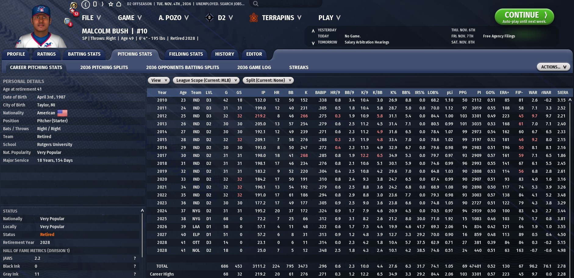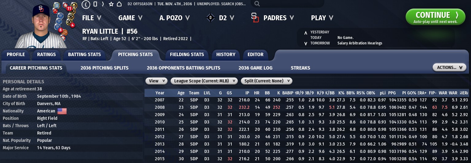 CF Mel Irving, Baltimore Terrapins, 2026 The Terrapins’ young center fielder’s greatest season came the year after he hit the greatest home run in Terrapins history, a walk-off, come-from-behind two strike blast into the right field stands at Terrapins Park. He followed up that homer with an MVP year: a league-leading 8.9 WAR, driven by his defensive value (resulting in his first Gold Glove) and a .320/.372/.523 line with a career-best 35 homers (the only time he cracked 30). His 190 hits and 340 total bases each led D2. While Irving remains one of the greatest defenders in the game, with 11 straight awards in center, his offensive game has never been as good as it was in that age 23 season, when he was the best in the game. CF Kyle DuBell, Chicago Whales, 2029 Another young CF with one extraordinary season. DuBell was never the defender Irving was, but at his best his bat made up for that value, including in his only MVP season, 2029. DuBell hit .296/.364/.631 with 44 homers and 39 doubles, driving in 128 for the D2 champion Whales. His 8.2 WAR led D2 that year, and helped the Whales climb back to Division 1, where the franchise originated. DuBell’s 2029 was in the middle of his most productive stretch as a player, but he fell off a cliff after his age 29 season and has never regained his production, topping 3 WAR only once since 2031. LF Pedro Quiroz, New Orleans Zephyrs, 2029 Some of the highlights of Quiroz’s amazing 2029 are detailed in the previous section, and in truth this list could have replaced this year with 2028, 2030, or 2026, all of which ended with higher WAR totals than 2029. But 2029 was a season of legend, in which Quiroz cemented himself as the Federation’s greatest slugger, smashing the record of 60 homers in a season by two, and the total bases record by 1. Quiroz batted .313/.374/.664, and led D2 in at bats, plate appearances, hits, slugging, runs created, wRC+, runs, RBI, and OPS - though, incredibly, not WAR: his subpar fielding dragged his value down to a “mere” 6.5 WAR. Despite that, the season remains one of the most cherished and remembered in NABF history, a bit of New Orleans magic at the end of an incredible decade of baseball. 3B Brian Runnion, Charlotte Hornets, 2025 The only infielder on the list for these cycles is Runnion, who held down third base for the Charlotte Hornets through most of the 2020s. It’s almost impossible to choose between his 2025 and 2026 seasons, but the Hornets’ conference title in 2025 puts that year over the edge. Runnion was both the team and Division MVP in 2025, the first of his three awards, as he hit .294 while leading the Division in on-base percentage (.439), slugging (.604), OPS (1.034) and WAR (8.3) as well as a host of other categories. He was far and away the best position player in Division 4 that season, his 8.3 WAR amazingly close to double that of the next closest, the San Antonio Missions’ Sam Martinez, with just 4.8. CF Bobby Usry, New Orleans Zephyrs, 2027 Just as his teammate Quiroz would do two years later, Bobby Usry captured the sport’s attention in 2027 with a record-breaking run as he targeted Jonathan Allen’s 220 hit record, set with the Salt Lake Gulls all the way back in 2010. He would do so successfully in the season’s final week, with the record-breaker stopping play in New Orleans as Usry - already an established star though in only his second season in the Big Easy - was honored by the club. He would go on to set the Division 4 single season hits record with 225 in 2031 while with the Browns; he would also set the all-time hits mark that season, a mark he continues to both hold and grow. Pitchers SP Jim Betz, Baltimore Terrapins, 2025 Jim Betz was 36 years old, in his third season with Baltimore. He’d just returned to Division 2, where he’d begun his career with the Havana Sugar Kings, a franchise where he’d had his finest years, and while he’d been excellent for the Terrapins in 2024 many doubted he’d be able to repeat it as Baltimore climbed the ladder. He didn’t: he blew 2024 out of the water with a sterling 20 win season in which he threw almost 220 innings and allowed only five home runs. Five. On top of that incredible figure, Betz put up a 2.27 FIP (57 FIP-) and 8.2 WAR while taking home both a Championship share and a Pitcher of the Year award. On a team of stars, it’s hard to say Betz was the biggest reason the Terrapins did what they did in 2025, but he was certainly in the inner circle. SP Bob Paul, Los Angeles Angels, 2026 Bob Paul has now had two successful careers: the first between 2020 and 2028 as an ace starting pitcher for the Los Angeles Angels, and the second as an all-time great closer with seven different franchises since 2029. This season was the finest of that first career, as he provided a struggling and in-transition Angels squad with its only true anchor. Paul went 16-6 for a losing franchise, striking out just under a batter an inning with a 2,81 FIP (64 FIP-). He walked just 5% of the hitters he faced that year, dominating a tough Division 1. He was denied a Pitcher of the Year Award - it went instead to Boston’s Hector Rayfield for an almost objectively worse season - but he was clearly the most valuable pitcher to his club, and maybe the only thing in those years that kept LA out of Division 2. SP Brian Tate, Albuquerque Dukes, 2026 Tate had a short career, but a brilliant one. For four years with the Dukes, he was the best there was in both Division 4 and Division 3, leading in WAR each of those seasons while revitalizing a struggling Dukes franchise. 2026 was the second, and greatest, of them, as Tate earned 7.7 WAR with a miniscule SIERA of 1.59, a 54 FIP-, and an almost unheard-of 12.1 K/9, which at the time set a record among D4 starting pitchers and was one of the top all-time NABF marks. He also held opponents to just 1.4 walks per nine, also a D4 best. The season earned him the first of his two Pitcher of the Year Awar