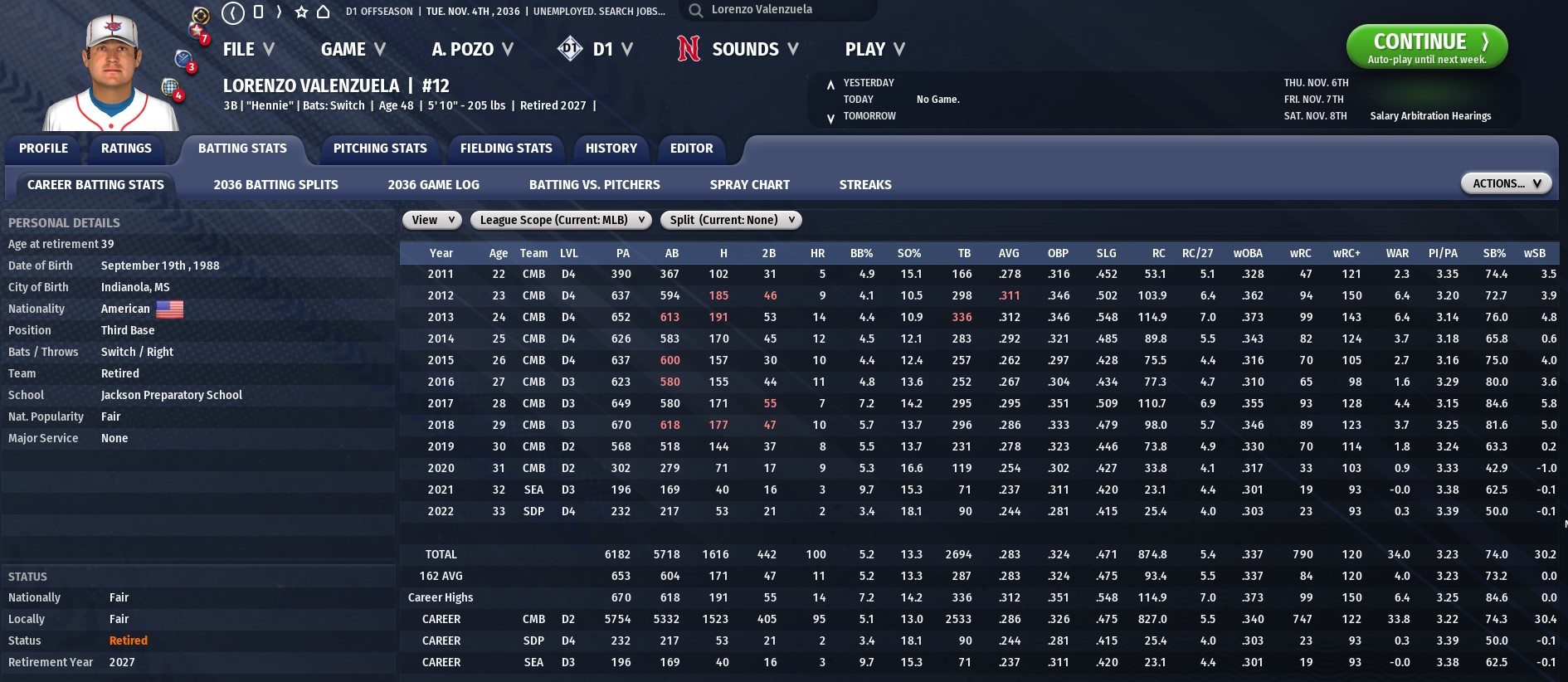 Ramon Rodriguez, Division 3 Calgary Outlaws, 2009: Rodriguez didn’t age gracefully, but in 2009 - his age 24 season - he put up arguably the greatest single season by a position player in NABF history for the D3 West Outlaws, leading the league in all three slash categories with a /339/.426/.688 line while smashing 50 doubles and 40 homers to lead the Federation at 375 TB. He combined that line with a Gold Glove season in RF to hit 12.2 WAR in 2009 - no player at any position has come within 1 WAR of that mark, before or since. Francisco Carreno, Division 1 Los Angeles Angels, 2012: A contender for the greatest offensive season in NABF history, Carreno’s second Triple Crown came along with 51 homers, 151 RBI, and a slash line of .365/.458/.704. His Slugging percentage, along with his 1.16 OPS, are both D1 records. Carreno, along with SS Dennis Sokol, led the Angels to five straight Division titles in the period between 2009 and 2013, and Carreno - whose 2011 was nearly as good, with a still-D1 record 54 homers and NABF record 167 RBI - was the greatest offensive force of the team. Omar Arteaga, Division 1 Toronto Maple Leafs, 2007: Though the team itself finished 20 games under .500 on its way to a fifth place finish in the NABF’s inaugural season, it had a legitimate star in the 25 year old Arteaga. The best season of his short but illustrious career saw him hit .332/.429/.654, leading the league with 43 homers and a .654 SLG, but also dominating on the basepaths with 26 steals and a league-leading 11 triples. He won the D1 MVP easily, racking up 11 WAR, which remains a D1 single-season record. While Arteaga posted 9.6 and 9.5 WAR seasons in 2008 and 2009, his 2007 remains the pinnacle of his career. Carlos Jara, Division 4 Salt Lake Gulls, 2007: Jara was already an established star when the NABF opened its doors in 2007, but then he blasted those doors clean off with a 9.5 WAR season in which he socked 54 homers, drove 131, and batted .349, all league leaders. His .744 SLG and 1.164 OPS remain the highest single season totals in NABF history, as do his .491 wOBA and 231 wRC+. Jara was a huge factor in the Gulls dynasty that propelled them into D2 in their first six years, a period in which Jara posted 40.8 WAR. But this, his first, was his greatest. Dennis Sokol, Division 1 Los Angeles Angels, 2010: the greatest shortstop in the Federation’s history hit marks no one else has overcome in 2010, with a record .486 OBP that remains the highest in Federation history, and 93 steals, eclipsed only once since… by Sokol himself, with 94 in 2012. His 9.8 WAR is easily the highest recorded by a shortstop, as he walked 101 times while posting the highest OPS and RC/27 of his career (.950 and 11.0, respectively). He also hit two of his career 10 homers as the Angels took the D1 West, their second of five consecutive Conference titles. Pitchers Oliver Chase, Division 3 Las Vegas 51s, 2010: Chase, one of the all-time greatest hurlers in Federation history, was a workhorse for the 51s in the early years. While his 226 innings didn’t lead the league that year, his incredible 1.75 ERA, 44 FIP-, 10.2 WAR, and 291 Ks all did, with his WAR still the highest of any pitcher in Federation history. His Triple Crown, Pitcher of the Year season was highlighted by his no-hitter against the Cleveland Spiders in late April - with 14 strikeouts and no walks, one of the most dominant outings ever, and the only no-hitter of his career. Malcolm Bush, Division 3 Indianapolis Clowns, 2012: The greatest season by the game’s greatest pitcher. Though it incredibly (and controversially) did not win him the Pitcher of the Year Award, it was a vastly superior season to Oliver Chase’s (which did). Bush struck out 266 in 219 innings, with a 45 FIP- and 1.52 ERA, the lowest mark in NABF history. He allowed just 8 home runs all season, as he led his Clowns to their second straight D3 championship, lifting them into D2, where they would remain for the next nine seasons. Bush owns the best career WAR, strikeout total, and FIP of any pitcher in the 30 years the NABF has been in operation, yet one just a single Pitcher of the Year, in 2015. His 2012 should have as well. Antonio Venegas, Division 4 Baltimore Terrapins, 2009: Venegas starred for the Pins before their golden age, and between that and his career dominating the weakest Conference in that period of the NABF (the D4 East), he can be overlooked. But don’t, because he was astounding: in 217 innings of work in 2009, Venegas struck out 232 against just 63 walks, while allowing a mere 6 home runs. His 53 Fip- was the best of his career and among the lowest marks for any D4 pitcher (or any NABF pitcher). 2009 was one of Baltimore’s three first place finishes in the decade plus before their superhuman run of the 2020s, and Venegas was the single biggest reason why. Randy Alcala, Division 2 Ottawa Champions, 2012: Alcala’s 2012 is among the greatest power pitching seasons ever, as the Champions righthander used his devastating fastball/change/slider combo to overmatch 315 hitters - at the time an NABF record and still higher than any recorded outside Division 2. The same can be said for his stellar 13.3 K/9. It was Alcala’s only great season, with an 8.2 WAR far higher than the runner-up, a 3.9 mark the next season. He was the only thing that went right for Ottawa in 2012: the team was relegated to D3 for Cycle 3 and Alcala opted out, signing on with the Angels, where he was a piece of three D1 Championship teams. Mike O’Neill, Division 1 New York Giants, 2012: O’Neill’s 2012 set the standard for D1 pitching, in a Division that has been defined far more by its prodigious offensive talent. O’Neill’s 8.3 WAR is the highest for any D1 season, driven by his 2.16 ERA, 200 strikeouts, and 1.03 WHIP, with a 2.58 FIP (58 FIP-). It was the only time O’Neill won the pitching Triple Crown in his career, and it resulted in the first of his two Pitcher of the 