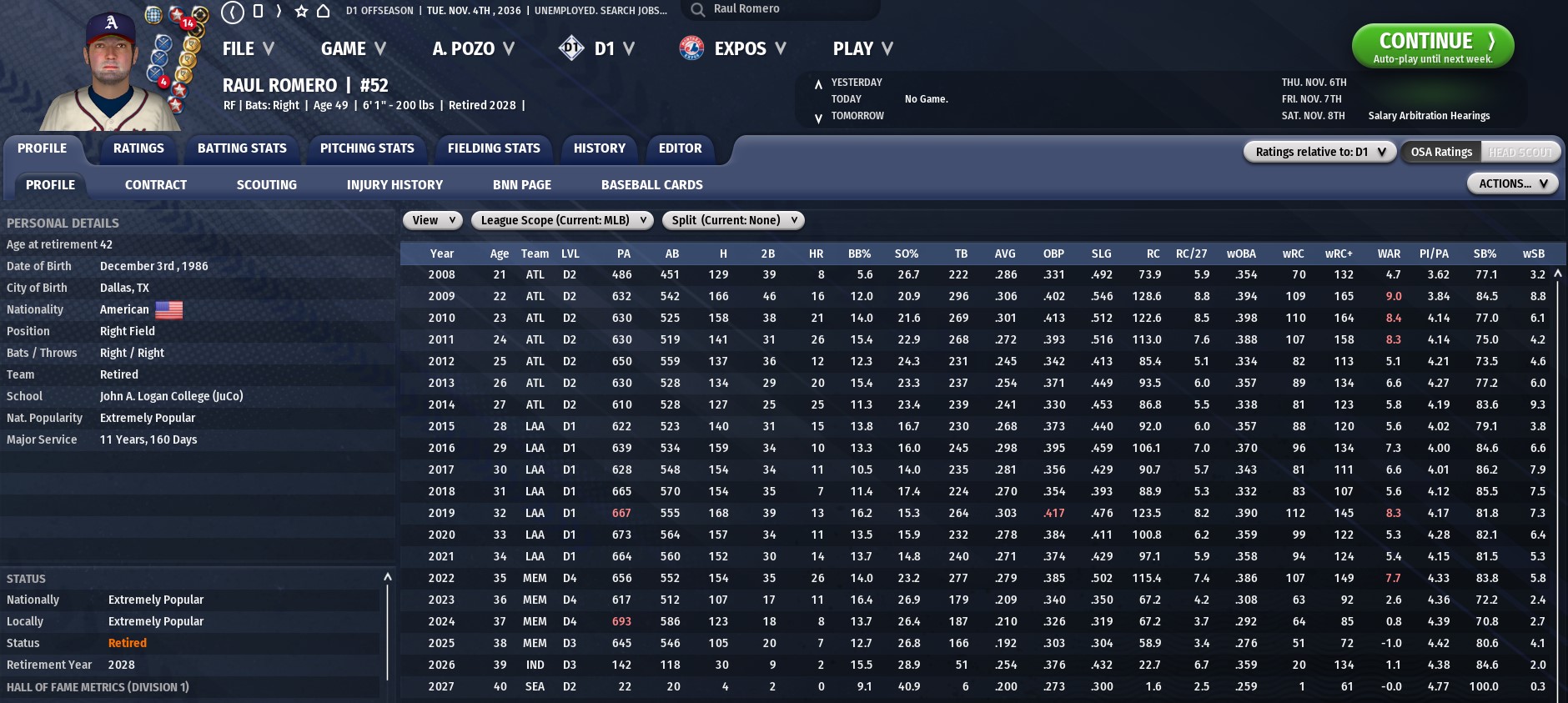 RF Raul Romero, Los Angeles Angels, 2019 Romero has a strong case as the greatest player of the first 30 years of NABF history. His career 103.3 WAR is the best of any player, a true five-tool star with 283 career home runs, top 5 records in doubles, triples, and stolen bases, three Gold Gloves, and two MVPs 12 years apart. But his 2019 may be his most complete all-around season: Romero won the third of his Gold Gloves that year while leading the league in OBP (.417), stolen bases (54), walks (108), runs (120), and WAR (8.3) while leading the Angels to their second best season, a 96 win Championship campaign in which they bested the Brooklyn Dodgers in a thrilling seven game set. Romero collected ten hits including a triple, hitting .333/.429/.400 in the series, his second ring with LA. LF Steve Mauck, Baltimore Terrapins, 2024 Mauck’s third full season in Baltimore will never be forgotten by anyone who experienced it firsthand. Muck shared a team with all-time greats - Betz, Padgett, Martinez, Molina - yet somehow stood head and shoulders above them as he chased impossible records all season - not quite reaching them, but in failing still putting together one of the three or four greatest offensive seasons to that point in NABF History. It’s easy to forget knowing where he ended, but the chase that captured fans’ imaginations at first was his pursuit of, first, .400 - Mauck maintained an average above that number almost into June - before attention turned to the home run chase. Mauck eclipsed New Orleans Zephyrs slugger Pedro Quiroz’s 57 - set the season before - with a full week to play, and pulled within one of Eric Bryant’s 60 for Kansas City in 2008 with five games left… and then stalled. A long fly on the season’s final day caught breath around the stadium, but it fell short. A groan, though, was followed the next moment by thunderous applause for Mauck: not only were his 59 home runs the new D3 standard (a record that stands to this day) but he batted .344/.435/.708, his SLG and OPS both still the highest in D3 history, and the .344 enough to net him the batting title. His 142 RBI also led the league, giving him the Triple Crown, and only his teammate Padgett’s total from the season before denied him that all-time D3 record as well. He won the MVP unanimously, and battered Sacramento in the Division Championship Series, hitting .409/.480/.636. It was the finest season in one of the finest careers in the history of the Federation. 1B Zach Markiewicz, San Francisco Seals, 2021 Markiewicz is a controversial player in discussions of all-time talent, but no one debates his exceptional 2021, a season capped by a monster performance - 2 homers, 12 RBI, .450/.532/.800 line and the Series MVP - to give his Seals their first and only Championship. Markiewicz was a huge reason they were there in the first place, too, winning the Triple Crown with a 59 homer, 152 RBI, .323/.440/.701 season from first base. Markiewicz played every game of the Seals’ season, leading D2 in Plate Appearances along with virtually everything else, and won the MVP easily. His 9 WAR in 2021 is his highest total by a good margin, though, coming at the center of a relatively short peak. Still, if any season can put a player over the bar into discussion of all-time greats, this is a good one to choose. 2B Doug Padgett, Baltimore Terrapins, 2023 Padgett was entering the final portion of his incredible career in 2023, the first season in which he gave up his role as a starter to focus exclusively on offense after missing most of 2022 to injury. The results were extraordinary: 9.6 WAR splitting time between 2B and 1B, while launching 36 homers and setting a D3 single-season Batting Average record of .370, just decimal points under Max Hinkle’s all-time NABF mark. He led the league in all slash categories, with a .427/.628 OBP/SLG to go along with his average, and 36 homers to lead the Division. The campaign won him the MVP, and helped deliver Baltimore the first of their five straight 100 win seasons. Both Padgett and the Terrapins underperformed in a losing effort against eventual D3 Champion Seattle, but especially given the successes in the future, it’s easy to overlook that and simply stand in awe of Padgett’s season. 1B Craig Vest, Ft. Worth Cats, 2022 Among the three or four greatest offensive players in NABF history, Vest was at his best in 2022, putting up 7.6 WAR (a career high) while leading D1 in WAR, BA (.331), OBP (.414), doubles (55) and Runs Created (143.1) to go along with his customary first place ranking in steals (86, one shy of his career best). Vest is the greatest base stealer in NABF history and the only with more than 1000 career swipes, but he was never better than in 2022, matching those 86 with only nine times caught. Perhaps the greatest moment of his season, though, came when he hit for the cycle for the only time in his career, in late September against the Seals, sealing a victory that helped ensure the Angels 5th place over San Francisco amid fears of coming relegation. Pitchers SP David Miramontes, Atlanta Crackers, 2019 By 2019, Miramontes was 38 years old, in his second season with his fifth and last team. He was widely regarded as one of the most consistent and solid, if not truly great, pitchers in the NABF, but had won three Pitcher of the Year awards earlier in his career and was a two-time D1 Champion. Certainly no one expected that he was about to have the best four year stretch of his entire career, or that he would see a jump in his K rate, a drop in his walk rate, and the best stretch of groundout rates of his career. The change had begun in his final season with Montreal, as he saw a reduction in his walk rate and got even more groundouts than usual. But once he signed on with Atlanta, things really began to change, culminating in an 8 WAR 2019 in which he struck out more than 200 batters for the first time (231), and allowed just six homers all season. H