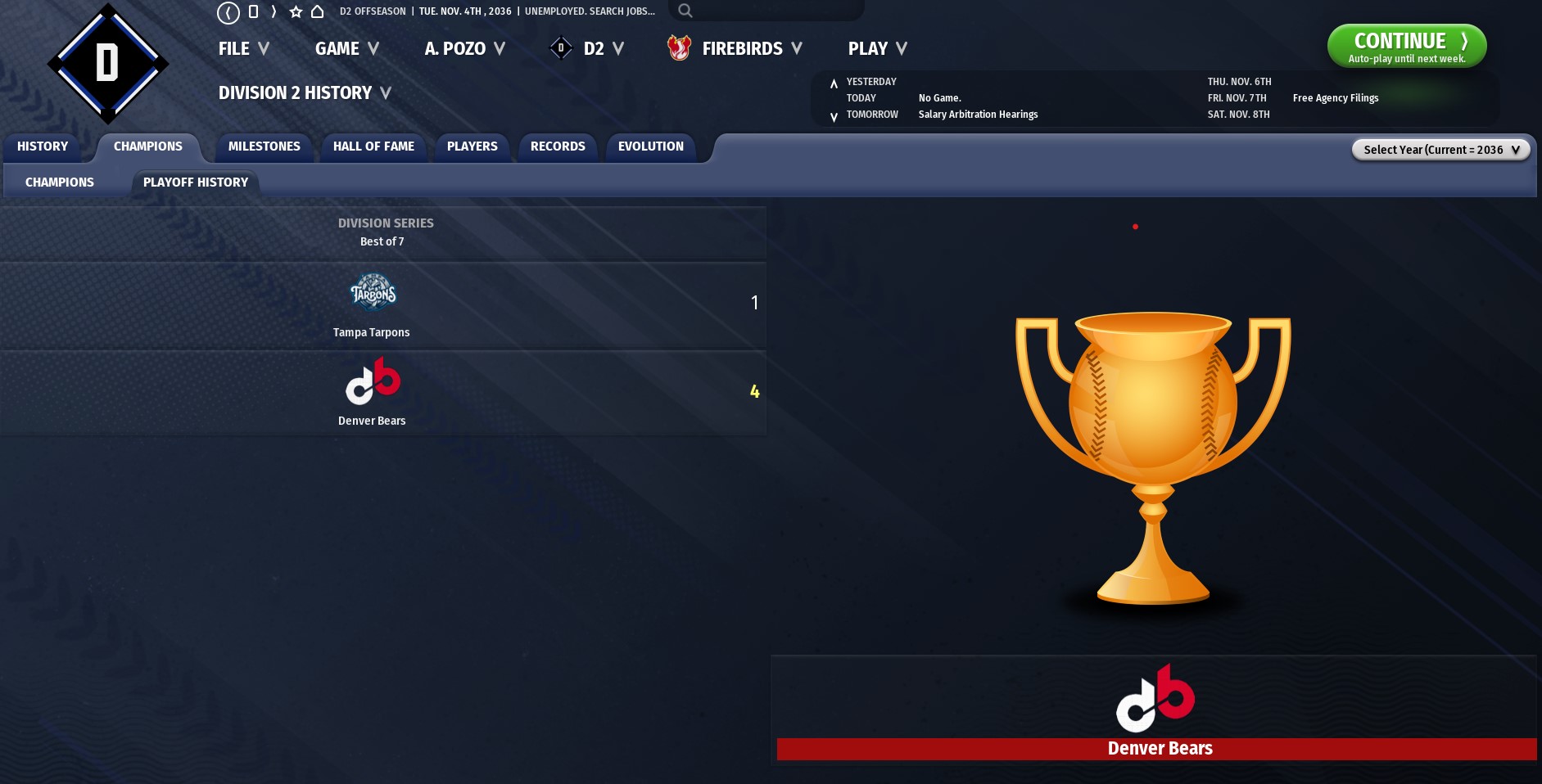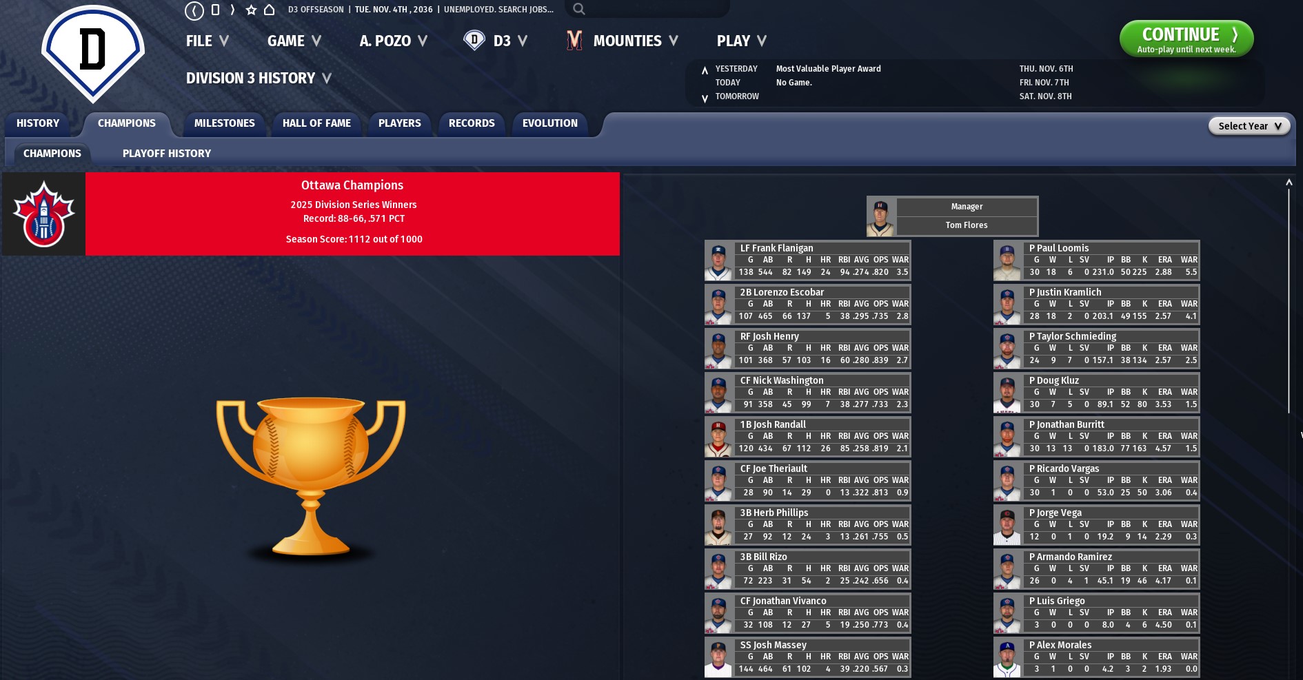 It’s Saturday, October 11, 2025, the second to last day of the 2025 NABF season, and there are four games on today. At 1pm, you watch Game 6 of the Division 4 Championship series; it’s been a good one, with the Albuquerque Dukes leading the Charlotte Hornets three games to 2. It’s a tight contest through 7, but now the Dukes have the bases loaded, though they’re a run back of Charlotte. There are two outs, but the light-hitting shortstop Steve Willis is up; he’s only had two singles during the series and has struck out 7 times. The count runs to 2-2. Then, a fastball, away. Willis lunges and manages a bloop down the line - it’s fair! It bangs against the corner where the wall juts out and scoots just far enough to elude Charlotte LF Xenophon Korkoris. With one run already in, the runner at second is now being waved around - with two outs, he’d been off on contact, and now he dives, his hand sweeps over the plate as the tag comes in, and he’s safe! Albuquerque has taken the lead! They score twice more that inning, and it’s sewn up - Albuquerque takes the title in six. You flip over just in time to catch the 4pm first pitch for Division 3’s Game 7. Another tight contest - this one a smashfest. You didn’t really have a rooting interest in D4’s ALB-CHR, but this one has a David and Goliath feel to it: The Padres are looking for their fifth Championship, and second straight after promotion from Division 4 in the offseason, while Ottawa - long one of the most hapless teams in the Federation - is here for the first time. You like an underdog, and they’re certainly that, but at the moment it doesn’t look great - after a few lead changes and almost as many pitching changes, San Diego is up by two heading into the ninth. We’re in Ottawa, though, so when ace Champions reliever Doug Klutz wraps up a scoreless top half, Ottawa’s top of the order comes due. Ottawa got here through pitching and defense, but they’ve turned on the power so far this series, so it feels like there’s a chance. When CF Nick Washington leads off the bottom half with a solo shot, the Ottawa crowd erupts, and no one sits down for the rest of the game. #2 hitter Herb Phillips Ks, and Frank Flanigan grounds sharply to third, but then the great Josh Randall steps to the plate. Randall signed with Ottawa in the offseason, as good a place as any to end a career, and then he found himself along for the ride. Randall has never won a Championship, and he wants it bad - he lines a single to the opposite field. Another single, this time from the speedy young 2B Lorenzo Escobar, and suddenly Ottawa has the winning run on first. Randall is lifted for a pinch runner as Josh Henry comes to bat. Henry is just 25, and didn’t even play a full season for the Champs, but was electric in the second half, and the crowd senses it. Henry doesn’t make them wait, turning on the first pitch and sending deep, into the RF corner - it misses a homer by inches and rolls toward the right fielder Gonzalez. One run is already in, and Gonzalez comes up firing but it’s too late! Escobar crosses home standing up, into a pile of his teammates - the Champions are Champions, and in walk-off style! The exhilaration of that win almost makes you forget that the D2 Championship game 6 started at 7 - it’s already well into the third when you flip over. The Baltimore Terrapins had won an astonishing 115 games in 2025, easily the most in the Federation’s history, and their victory over Vancouver seemed an almost foregone conclusion, but they’d dropped the first game in Baltimore and had narrowly won the second. The Mounties crushed Danny Rzasa in Game 3, but the Pins came back to take the 4th and 5th, and now stood on the precipice of becoming the first team with championships in three different Divisions… but as you tune in, you see a 5-0 Mounties lead, already. This time they’ve victimized Martinez, who was brilliant in Game 2 but is on the ropes here. The Mounties add two more in the 5th, and another in the 6th; a Steve Mauck solo shot eases the pain in the 7th, but not by much. The Division 1 game is starting up soon, and you figure you can flip back here and there - if the Pins come back somehow, you’ll catch it. They don’t, and you watch the Philadelphia A’s take all the drama out of their own Game 7, vanquishing El Paso 6-2 after a two homer performance by 1B Jake Haston - he hit two earlier in the series and is an easy selection as series MVP. You watch until he finishes his quick shoutouts, hoisting the MVP trophy while his teammate, the great catcher Corey Cerrone, holds the championship cup behind him. Then you switch it off and head to sleep. So now it’s October 12, and only one game remains between baseball and the offseason: a Division 2 game seven between the best regular season team in NABF history, and a Mounties club whose 94 wins are hardly nothing, but still pale in comparison to that juggernaut. Or so people have said, anyway: here they are, now, one win away from an upset victory over a superteam. And it’s Rzasa, again: he’d had a terrible Game 3, which, if repeated, could mean a long offseason in Baltimore. Rzasa hadn’t lasted past the second inning in Game 3, but in Game 7 he manages four plus before exiting, his Terrapins leading 6-4 after a Doug Padgett bases-clearing double in the third off promising young starter Danny Pierson. Philadelphia’s manager will take heat for starting the youngster in this series, you think. Padgett has given the Pins an extraordinary series so far, but once Rzasa left things have gone awry, and it looks like that effort might be wasted as Vancouver drops two on Baltimore’s pen in the seventh, tying it up. In the eighth, they finally get to David Linder, who has handcuffed them in four scattered innings over the rest of the series, and entering the ninth it’s 7-6 Vancouver. Baltimore closer Matt Heitzman sits Vancouver down in order, as he has all 