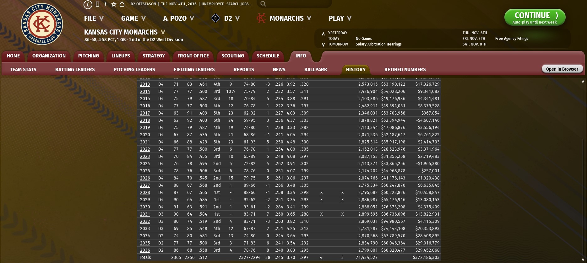 Though this was a period of change, some things stayed the same: the El Paso Sun Kings continued their reign of Division 1. Between 2031 and 2036, the Sun Kings won four Conference titles and two Division Championships, their 2036 squad winning 99 games, more than any other in franchise history. Their offensive core - CF Joe Rison, C Mike Kepler, RF Chris Beardsley - are all in their prime years, and though the solid pitching staff is older they have continued to be effective. Even 30 years in, El Paso was still able to mix veterans and developing players to create yet another winning ballclub. It was not quite as easy a tale for the Ft. Worth Cats. Relegated to Division 2 for the first time in franchise history to begin Cycle 9, they were able to cut through a weak division, winning the D2 West in 2031 and Division 2 itself in 2033. But their fortunes began to fade in 2034, despite earning promotion on the strength of the first two seasons. Back in D1 for Cycle 10, they struggled mightily, with three straight last place finishes to head back down. Replacing the Cats in D1 West will be Denver’s Bears - after winning the first franchise championship - or conference title - in 2030, the Bears clawed their way through Division 2. In 2031 they finished in third, but just two games back; the following year they came in second, a single game behind Fort Worth. But in 2033 they eclipsed the Cats to win the D2 West, losing to Toronto in a well-balanced series. They came into Cycle 10 the heavy favorites for promotion, with a deep team led by Chad Martucci, Clemens Young, and others. They won the conference in 2034 and 2035, then finally got over the hump (with the help of free agent signee SP Dylan Anderson) and won the D2 Championship, officially securing promotion to Division 1. What had once been the most disappointing franchise in the NABF will now be on its largest stage. The Tampa Tarpons will join them there. Tampa has been one of the most successful franchises in the NABF, but with only sporadic success, and never able to move beyond Division 2. But in Cycle 10, they won two Conference titles and the 2035 D2 Championship (beating Denver) to earn promotion. Tampa’s current lineup uses a distinctive speed and contact style that promises to shake up Division 1. The biggest story of the last decade of NABF ball, though, has been the Kansas City Monarchs. For 20 years, they remained a quiet Division 4 team: one lone conference title in 2011 and several last place finishes, despite stints by some of the greats (most notably slugger Eric Bryant). But in 2026 they started winning, consistently and convincingly. In the first year of Cycle 8, they won their conference, and for the first time their division; they repeated the feat in 2029. That ensured promotion, but a downturn in 2030 suggested their time in D3 might be short. They proved their doubters wrong, winning 90 games, the D3 East, and the D3 Championship in 2031, and though their win totals dropped each of the next two years they were enough to stamp KC’s ticket to Division 2. They held their own there in Cycle 10, gaining each season, and ended 2036 with 86 wins, only a few back from first and ready to see what lies ahead. In Division 4, the Nashville Sounds went on a run for the ages too, winning three consecutive D4 titles between 2031 and 2033, giving them four over their history. With a D3 East conference title in Cycle 10, they look to build further. The same can be said of the Sacramento Solons, who were promoted from the D4 West as the Sounds left the East; they had lost to Nashville in the Championships in 2032 and 2033, but once in D3 they kept going, winning the D3 Series in both 2034 and 2035 to earn promotion to D2 in Cycle 11. Amid all this upward movement, two once triumphant franchises began to fade. The Boston Bees were the first to go; only two years after their final championship in 2029, they found themselves in last place, 72-82. It got worse the next season, with their win total dropping to 65. Then, 57 wins in 2033, and a slam-dunk relegation. The very next year, it was Baltimore’s turn. As fewer and fewer faces from the Terrapins’ incredible 2020s runs came back year after year - Padgett traded away in 2029, Mauck gone after 2031, Hinthorne after 2032, and so on - the Terrapins spent Cycle 9 floating between 2nd and 4th place. But the bottom dropped out in 2034, and the team won just 60, 65, and 66 games respectively over the three years of Cycle 10 - last place all three, and relegated for the first time in their history. As the first ten cycles - 30 years - of NABF history ended in 2036, an amazing confluence of retirements swept through the NABF as some of its best all-time talents hung it up: all-time steals leader Craig Vest, all-time Home Run king Pedro Quiroz, all-time hits and doubles leader Bobby Usry, Baltimore Terrapins great Steve Mauck and Two-Way star Nick Goodwin. We watched some of the greatest teams in its history sink, while new dynasties struggled to be born. Who knows who will rule the next 30? Maybe it will be San Diego RF Jason Turnquist, who won the D2 Rookie of the Year this past season. Or 27 year old 2034 D4 Pitcher of the Year Aaron Cottrell. Maybe it will be the Phoenix Firebirds, who won their first Conference title in 2036 after years of futility. Maybe someone we can't predict, or a team we don't expect. The game will surprise you, sometimes. Next: Greatest Individual Seasons, 2031-2036 Last edited by ArquimedezPozo; 01-01-2023 at 04:11 PM. |