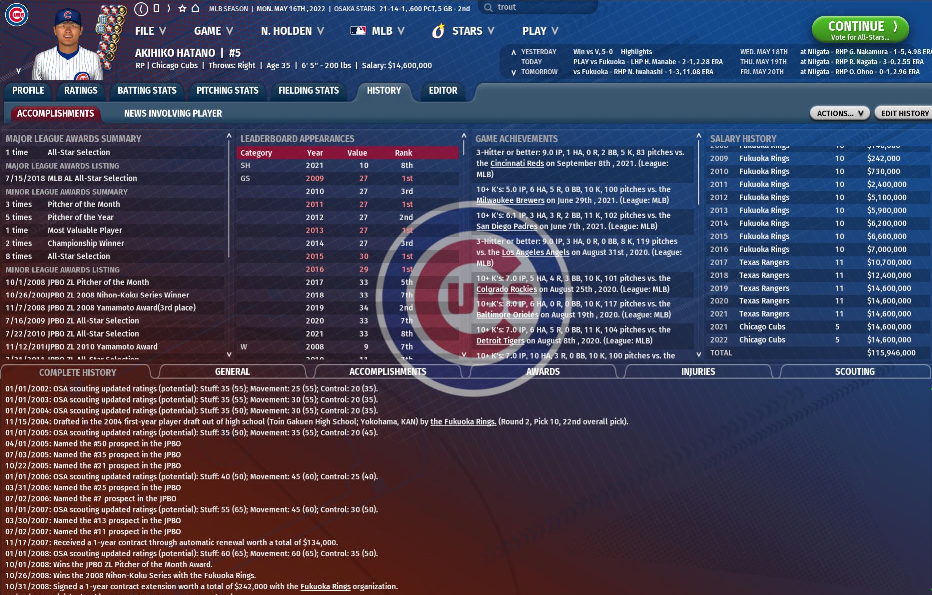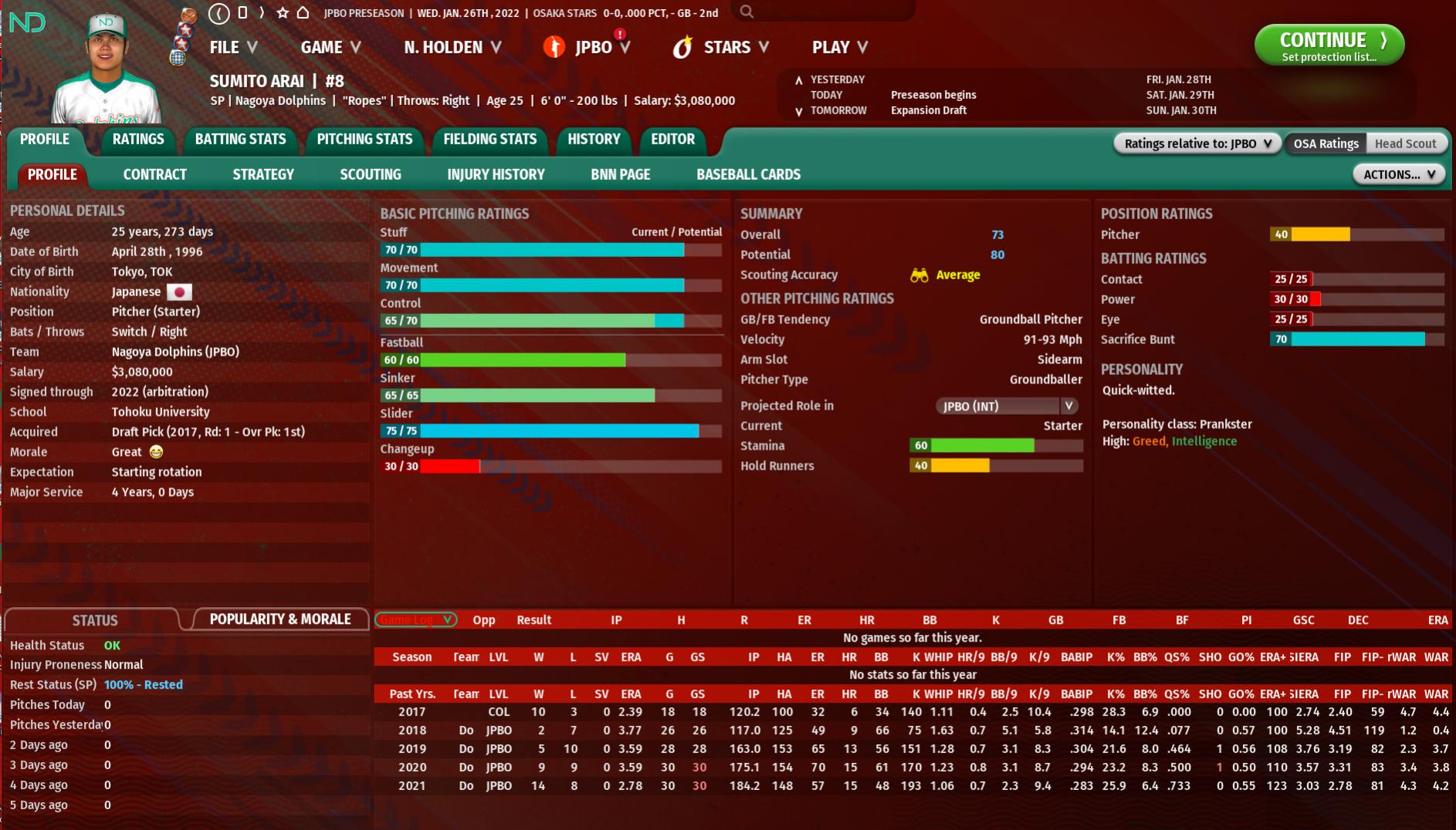 Some observations - 1. I added all the US indie balls, KBO, CPBL, Mexican League, and Cuban leagues as template to this universe. US indie balls might break the immersion since some of the players playing in US indie ball might have retired or are still playing in MLB. I have also seen a few players (like Addison Russell) could both be playing in mexico and usa if mexican league is added So my suggestion for those who wants to add more leagues to this universe, is to add KBO, CPBL and the Cuban league, which dont have too many active/former MLB players playing in - which can avoid the issue of two addison russell playing in the same universe. I might create a new template with these additional leagues (and possible indie ball leagues in the US and Japan) to mimic the OOTP MLB experience which makes this universe more complete. 2. I don't know what happened in this universe but there are lots of players that have very very low avoid k but high walk rates. Very odd to find out that. 3. For some reason, some players, especially two way players (at least Shohei Ohtani) are stuck in the minors despite having great hitting tool or pitching ability. Not sure what happened there. 4. Due to having only two professional leagues in this universe, there are many Japanese players playing in the MLB or its minor league systems. 5. I would suggest to turn up trading frequency to average if playing in JPBO so more trade activities among AI teams. 6. I love the low injury setting. It saved a lot of pitchers' careers. 7. The JPBO is on another level than the modern ***. After 70 years (since 1950) of drafting and development, based on what I have seen, the talent level between MLB and JPBO is small, especially on the pitching side. Almost every JPBO team has 2-3 pitchers that can play in MLB. Hitting wise, slightly worse than MLB in this universe, but there are a lot more talent, and when they go over to MLB, they succeed. I have even seen Japanese catcher (who definitely needed to hit enough to stay in the lineup) starting in MLB. If we compare this JPBO to BPN, this JPBO has more talent, and some insane talent even. Murakami might just be a star but not a superstar if he were to play in JPBO. There are MLB superstar talent in JPBO. 8. This might be an odd discovery but Sendai drafted an American from University of Albany called Joey Edwin in the second round of 2020 JPBO draft. Might need to give him Japanese second nationality so that he would not take a foreigner slot. 9. Some save suggestions - Osaka (worst team in JPBO), Hiroshima (worst team in the Nihon league), Chiba (best hitter and pitcher combo) and Fukuoka (biggest budget). Also, in this universe, Sendai did not get Masahiro Tanaka so they are still struggling after the expansion. 10. Just noticed that player enters arbitration after 1 year in service, instead the 3 years, in real life. Last edited by uknownick; 02-08-2023 at 01:05 PM. |