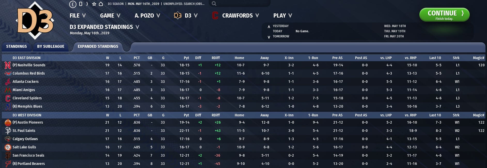 Division 2 The Boston Bees were 3-4 and the Baltimore Terrapins were 4-3, with the end result of a two-way tie for first in the D2 East at 19-14 apiece. Baltimore’s early rotation struggles are perhaps starting to stabilize; after some adjustment Cory Spry has been strong recently, while Eric Cool has made a nice transition from the pen, and Randy Putnam has been outstanding despite a 4-4 record. Baltimore’s offense remains strong despite a deep slump for Omar Juarez, last season’s MVP. Boston is in nearly the same boat: a powerhouse offense that leads D2 in Batting WAR, but a weaker pitching staff. The bullpen has been great after recent adjustments, though, with closer Tim Potter one of the best in the game right now. Three teams sit at 16-17, three games back from the leaders. Ottawa has been surprisingly strong this season and has a +15 run differential with a top 3 offense led by DH Brian Pressley and 2B Omar Arredondo. Ottawa’s bullpen has also performed well early, but the rotation has been a disappointment and could use an upgrade. New Orleans has a top 5 offense but much of that can be attributed to Carlos Ybarra’s early season explosion; Kyle Hickenbottom has nearly matched his power with 12 homers of his own, but Robert Zermeno hasn’t heated up yet. New Orleans will also need some bullpen stability. Montreal is the third club three games back, and has struggled offensively; the pitching has been solid but the club could really use Bubba Fread, who is on a rehab assignment in the minors as he prepares to make his season debut. That leaves us with Detroit, at 15-18 but with a 4-3 week that suggests they may be turning things around a bit. The Buffaloes stay on top in the west, and have now significantly increased that lead after a 6-1 week that included two wins apiece against Baltimore, Boston, and San Diego. While their pitching staff is aging and has significant holes, there’s no denying this squad can hit, with a dynamic young lineup centered on 1B Doug Frey, DH Bill Tucker, and C Justice Slaton. Houston is the only team in the west with a positive run differential; the next three teams, all tied at 16-17, have some work to do. San Diego has the best pitching in the Division with Brice Asmus pitching like an ace and Max Cartmill having the season of his life, plus good campaigns from young starters Alex Ojinaga and Aaron Meadows. But the hitting is another story, as San Diego has socred only 105 runs this season, the fewest of any D2 club. Sacramento is in a similar boat, as Yusuke Kondo and Josh Argo have led the way in the rotation with newly-acquired closer Xavier Mayes approaching lights-out status at the back end, but with little offensive contribution from their big bats so far. Vancouver is in this group too, but the Mounties just dropped four straight to Ft. Worth and Baltimore after pulling into second in the Conference at the start of the week; they’ve had some standout pitching performances, but the offense hasn’t arrived yet. That’s especially true of Leo Rodriguez, who has hit only three homers this season - fewer by five than his total in last season’s Championship Series. Ft. Worth was 4-3 this week, but an even better sign for them is the hot hitting of Jesse Moeller, who took a while to get off the ground but who hit .391 with a .609 SLG this week. Kansas City continues to flounder in last place, and seems destined for a relegation. Player of the Week: Bill Tucker, RF, HOU: .481/.517/.963, 4 HR, 9 R, 9 RBI - 3 HR game, 5/14 Top Hitters: Devon Johnson, 3B, BAL: .412/.517/.963, 2 HR, 4 R, 2 RBI Leo Rodriguez, 3B, VAN: .429/.448/.607, 1 HR, 5 RBI Jesse Moeller, CF, FTW: .391/.417/.609, 1 HR, 3 R, 3 RBI Top Pitchers: Brice Asmus, SP, SDP: 9 IP, 0.00 ERA, 0.82 FIP, 12 K, 5 HA, 1 W Cory Spry, SP, BAL: 9 IP, 0.00 ERA, 1.16 FIP, 9 K, 6 HA, 1 W Rhett Frew, SP, KCM: 17 IP, 1.59 ERA, 1.16 FIP, 23 K, 2 W League News