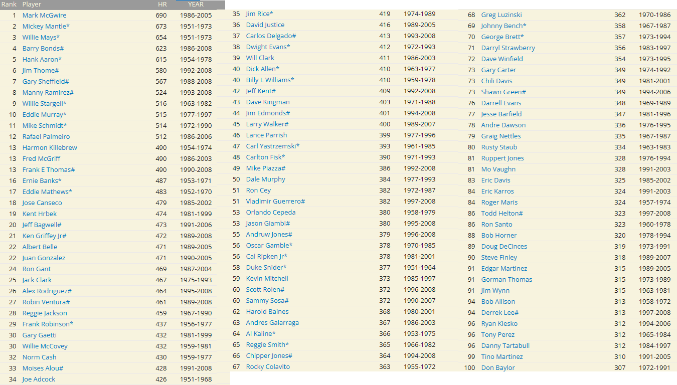 Since the years selected were to cover the full careers of Mantle, Mays, Aaron, and Bonds, some might be interested in the HR totals. Also including BA and WAR. Recall baseball doesn't exist before 1951. Last edited by Brad K; 04-19-2023 at 01:10 PM. |
