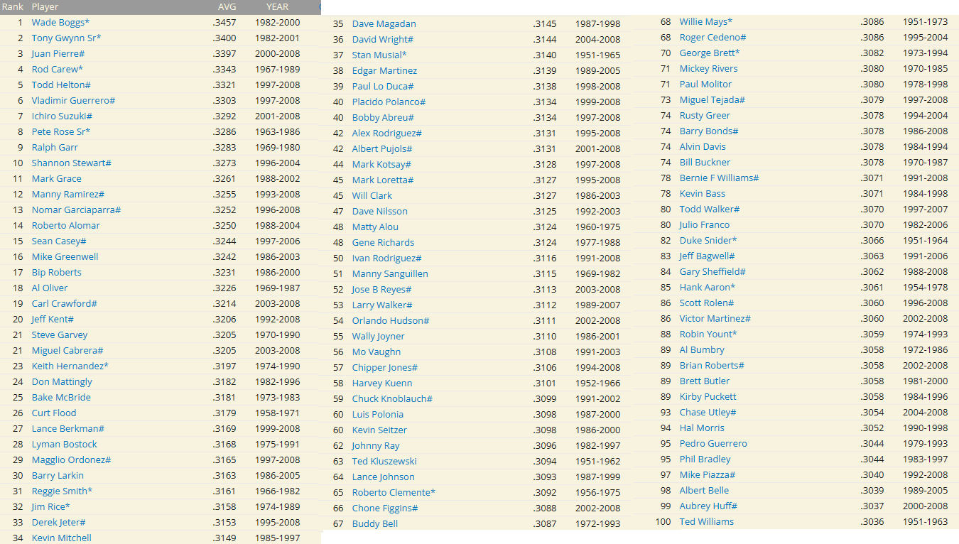 Since the years selected were to cover the full careers of Mantle, Mays, Aaron, and Bonds, some might be interested in the HR totals. Also including BA and WAR. Recall baseball doesn't exist before 1951. Last edited by Brad K; 04-19-2023 at 01:10 PM. |