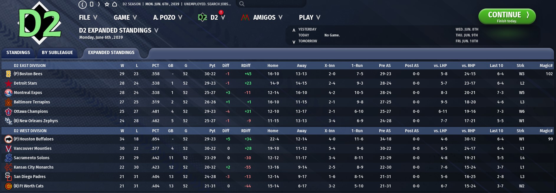 Division 2 The East is tightening, as Boston’s three game lead dropped to one this week. The Bees were two and four against Kansas City, Vancouver, and Ft. Worth, getting shut out by Steven Smith of the Mounties on Wednesday. That worked to Detroit’s benefit, as the Stars rode Matt Petrick’s strong hitting to a 4-2 week, taking two of three from the third place Expos. Montreal is a game below .500 but a good couple of weeks could put them into real contention. The same is true of the Terrapins, whose hitting has rebounded in recent weeks. The Champions and Zephyrs are tied 8 games back, though the Champions continue to entice with a +23 run differential - there’s a world in which they’re just 4 games back of Boston, it’s just not this one. In the West, Houston’s dominance continues, though the lead has shrunk from 8 to 6 over Vancouver. Watch out for rookie leadoff hitter Aaron Ferguson: the club has stuck with him this year and it has paid off, as the 24 year old 2B is hitting .310/.402/.417 in June. The Buffs still need arms, though, and minor deals may not cut it: they need a strong #2 or #3 starter to stabilize the staff and allow either David Olson, Matt McNutt, or Curt Loy to transfer to the pen. Vancouver is doing their best to challenge Houston, with a 5-1 week and big series wins against both Boston and Baltimore. The Mounties are Houston’s photo negative - a great pitching staff backed by a questionable lineup. Leo Rodriguez has been hitting for more power this month but Vancouver still ranks tenth overall in runs scored. Below them, Sacramento, Kansas City, Fort Worth, and San Diego are all fighting to stay out of last place. Player of the Week: Ray Nierman, CF, MON: .500/.565/.900, 4 2B, 2 3B, 5 R, 2 RBI Top Hitters: Sam Campbell, 3B, KCM: .556/.600/.667, 2 2B, 3 R Matt Petrick, 2B, DET: .400/.455/.800, 2 HR, 1 3B, 4 R, 8 RBI Josh Hinthorne, 1B, OTT: .391/.440/.739, 2 HR, 2 2B, 7 R, 3 RBI Top Pitchers: Chris Yeadon, SP, MON: 1-0, 15.2 IP, 0.57 ERA, 1.57 FIP, 17 K Rhett Frew, SP, KCM: 2-0, 15.2 IP, 1.15 ERA, 1.63 FIP, 23 K Billy Smith, RP, BAL: 1-0, 7 IP, 1.29 ERA, 1.31 FIP, 11 K League News