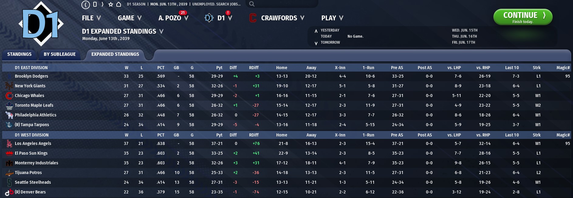 No huge shifts this week in the East, as the Giants remain on top. The New York club extended their lead to three games over Brooklyn, with Willie Rodriguez winning two of the team’s four wins, striking out 25 over those two starts, while the biggest highlight came with Roberto Estrada’s three home run game over Philadelphia on Monday. Brooklyn had their second straight tough week, losing four of six to El Paso, Chicago, and Tijuana. Young Venezuelan two-way player Ermino Rizzo had an encouraging start, but Carson Prince was quiet this week, nursing a bruised back. Philadelphia, briefly a third place team, sunk back down to fifth with an abysmal 1-5 record that included a sweep by Tampa, which Chicago and Tampa otherwise held steady, though Tampa made some headlines when T.J. Carcone tied Mike Mitchell’s all-time triples record - he hopes to break it when the Tarpons begin a homestand this week. The Blue Jays, meanwhile, scored a ton of runs, averaging 6.17 runs a game; the problem is they allowed 50, a little over 8 a game in that stretch. Toronto at this point looks like a near-certain relegation. The West, too, remains almost completely unchanged from last week, with the Angels, Industriales, and Sun Kings all going 3-3. Frank Mozo had an outstanding week atop the Angels’ lineup even as Brian Weisman hit a slump, going just 3-24. Things tightened a bit in the bottom half of the standings, as Tijuana dropped to 14 games back and Denver gained a game, while Seattle held steady. Player of the Week: Eddie Santana, 2B, TOR: .476/.542/1.524, 6 HR, 4 2B, 6 R, 14 RBI Top Hitters: Paul Lechter, RF, TMP: .476/.542/.905, 2 HR, 3 2B, 8 R, 5 RBI Benni Phillips, CF, TOR: .471/.591/.706, 4 2B, 7 R, 4 RBI Frank Mozo, 2B, LAA: .455/.520/.773, 3 2B, 2 3B, 6 R, 3 RBI Top Pitchers: Willie Rodriguez, SP, NYG: 2-0, 16 IP, 2.25 ERA, 2.15 FIP, 25 K John Hummel, SP, CHI: 1-0, 7 IP, 1.29 ERA, 0.99 FIP, 14 K, 3 HA Nick Padley, SP, MRY: 1-0, 7 IP, 1.29 ERA, 0.99 FIP, 11 K League News