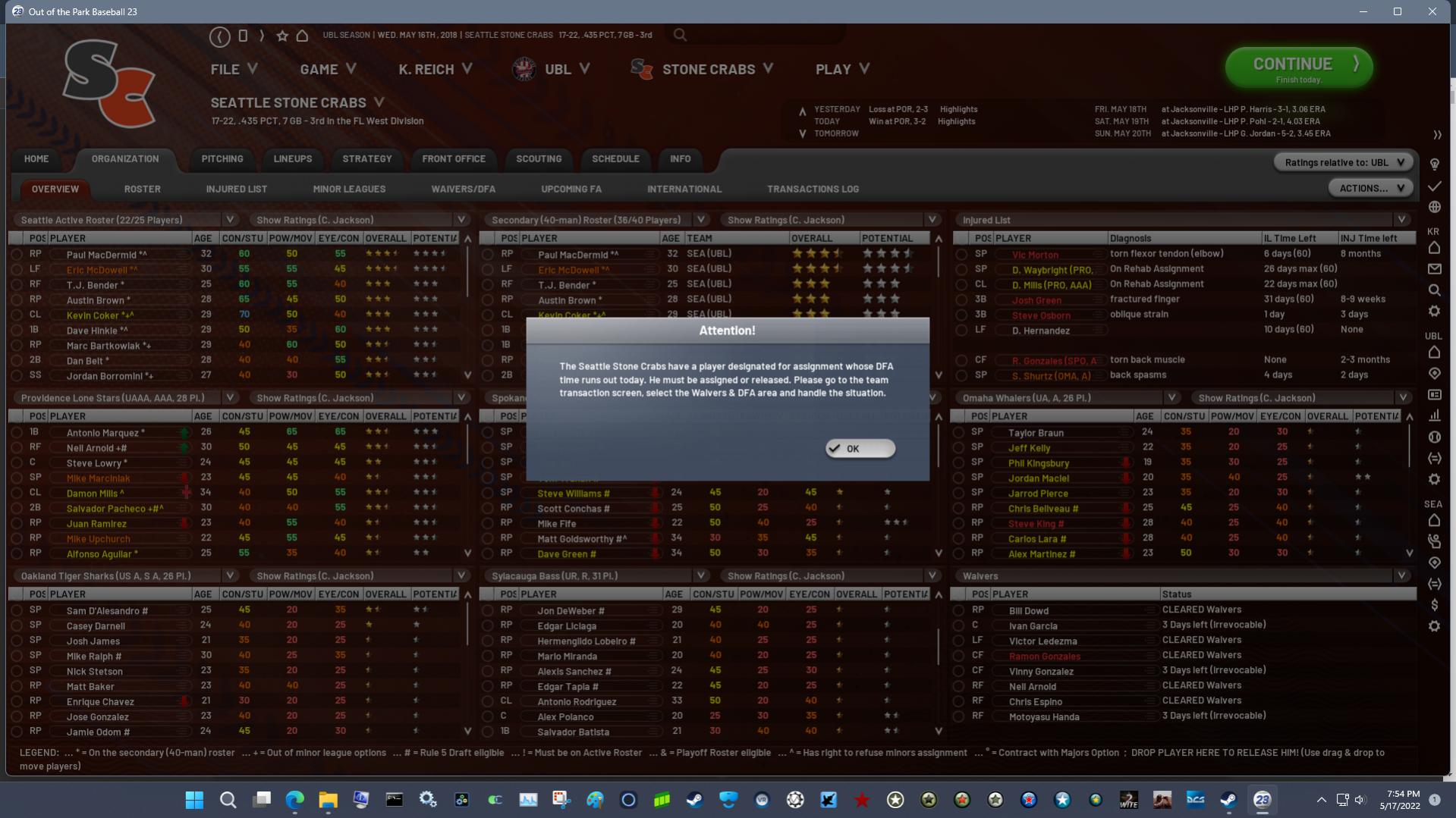 I have players hanging out also as shown on the screenshots below. Also, I cannot advance my game because of some DFA/Waiver issue that I can't figure out. The pop-up message should provide more detail on the problem, and also include a hyperlink that will take one to the player/screen where the problem can be resolved. It is ridiculous that this issue is preventing me from advancing my game. Matt/Marcus, this should not be happening can you please fix these issues? |