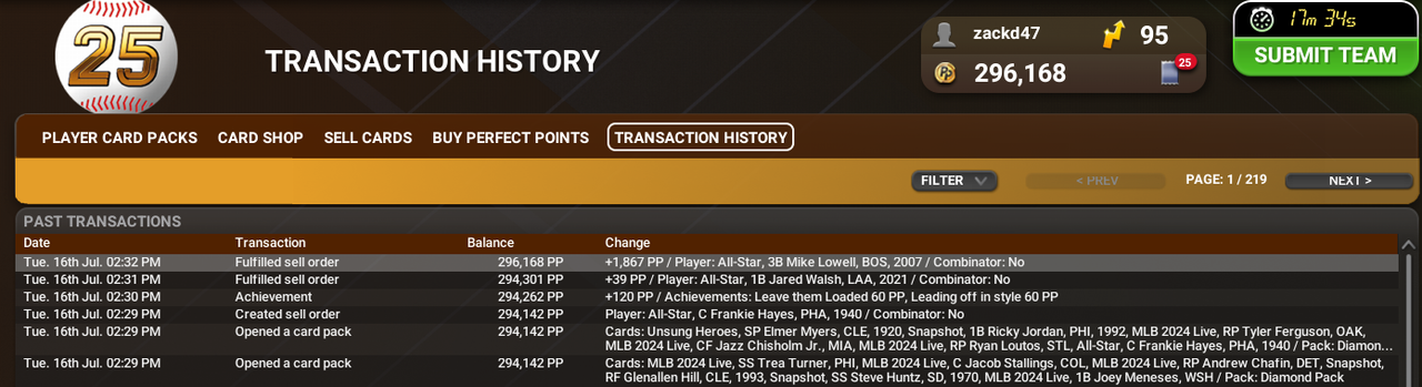 I was opening packs and took a break from opening packs to add a card to my lineup. After I submitted my lineup, I immediately clicked on a diamond pack to open it and my app crashed as soon as I clicked on it. Upon loading the app back up, the diamond pack is missing and the transaction log does not show that I opened it. I have the screenshot attached. (I opened the diamond pack at about 2:39pm) Please let me know if any other info is needed or if there is anything you can do to help. Thank you! https://i.postimg.cc/pLHTfFX8/Screen...2-42-26-PM.png Last edited by zackd47; 07-16-2024 at 06:52 PM. Reason: Wanted to add more specific info |
