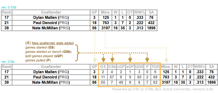 - added [ W ] win, [ L ] loss, [ T/OTL ] tie/overtime loss, and (s) starter tags for goaltenders if both goalies on the same team played any minutes. - greyed out a goaltender if they did not play any minutes. - added clutch/rare event tag description footnotes to the bottom of the box score report, if any occurred. Some tag numbers will reference players from history first identified or most known with an event. { 9 } for example, references Maurice "Rocket" Richard. (in '44-45 he became the first to score 50 goals in 50 games in an NHL season). These tags can be turned ON/OFF in config.txt . - league standings are now calculated on a daily basis and are accessible through a hyperlink in all box scores (box scores link and lock into league standings the day the game took place, and update for each new box score). This 'archive' of daily standings allows you to go back and view standings at any point during the season (All-Star break, trade deadline etc.), as well as to monitor how teams are trending. - added all scheduled games in a season series, with hyperlinks for quick access to previous box scores in the series. - replaced [ Penalties ] title with a light grey partition line. - removed other partition lines. Last edited by daigle91; 10-14-2024 at 10:25 AM. |