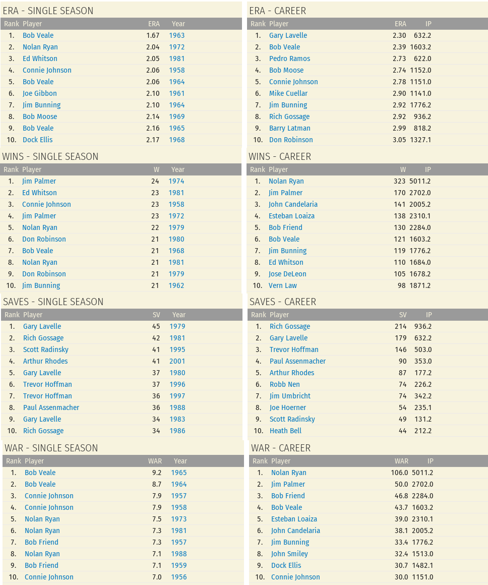 Bob Veale is the all time MLB leader in ERA but not the Pirate leader due to different IP requirements. (I've just noticed I didn't post MLB ERA leaders so that will be next. Last edited by Brad K; 04-21-2023 at 07:47 AM. |