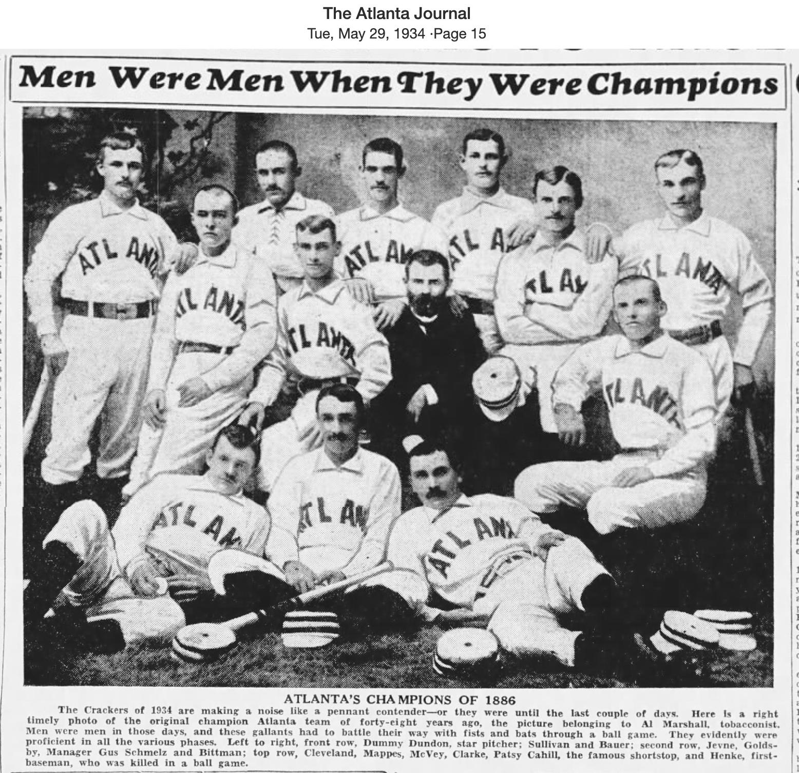 This photo was published in the Atlanta Journal on May 29, 1934. While the caption indicates it is the 1886 club, the players pictured were all on the 1885 team. The caption is one player short in the back row.