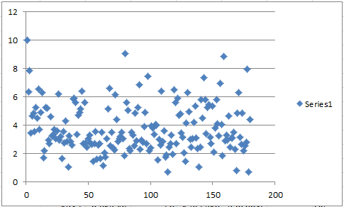 The mean score is 3.8, most closely represented by Kevin Mitchell (plot 102). The median score is 3.3, represented by Nate Colbert (plot 116) and Tommy Bridges (plot 51). The values for the Gorilla Composite are generated based on RL scores which are normalized amongst themselves. This leads to a skew. The RL mean will be 4.0, because that is how the score is defined, and that definition is used to generate the scores, here, in a different environment. Now that the league has completed, the scores for this HOF can be normalized to create a mean of 4.0, which will allow the scores of these careers to be directly comparable to the RL scores. That will come later. ADD: Note the regularity of plots above the 6 line, once the early entries have occurred. Last edited by VanillaGorilla; 09-20-2013 at 03:47 PM.  |