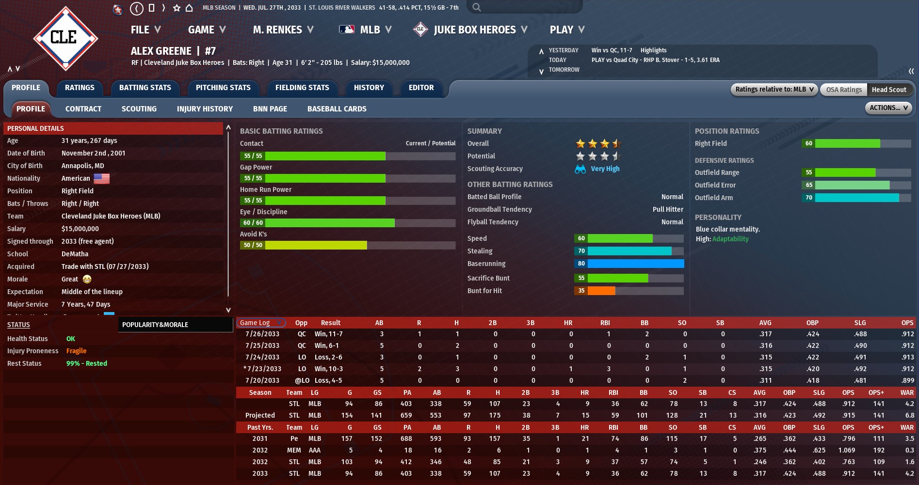 In the midst of their worst season in franchise history, the St. Louis River Walkers looked to build for the future trading closer Ernesto Barbosa, right fielder Alex Greene and outfield/first base prospect Jerry Perez to the Cleveland Juke Box Heroes in exchange for pitching prospects Danny Burch and Greg Sones.