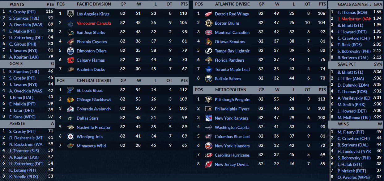 Sidney Crosby is re-establishing his dominance and absolutely lighting up the league this year. He is leading the Penguins back towards another President's trophy after a slow (for them) start. Definitely unfinished business for that group, including Kris Letang (leads all defensemen with 65 points) and Marc-Andre Fleury (again in the Vezina conversation) after their Stanley Cup Final loss last year. The St. Louis Blues have been surging and are now in the lead for the President's trophy, without any standout individual performances, their top scorer is Andy McDonald with sixty one points. The Los Angeles Kings have made great strides and are tied for the lead in the Pacific with the Canucks now. The Preds and Jets are tied for 8th in the West with six games remaining. In the East, Columbus and Tampa Bay are three and four points, respectively, away from the Senators for eighth in the east with seven games remaining. |