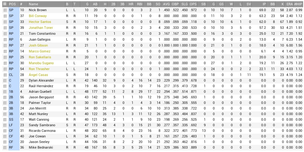 The Raccoons were in a wild offensive slump and now came across the South-leading Thunder, who were third in runs scored, yet eighth in runs allowed with considerable pitching issues. There were a couple of 6+ ERA starters on that roster, and one of them was old friend Ralph Ford. On the other hand, they had scored seven or more runs in a game seven times in their last 14 games. We had lost two of three to them earlier in the season. Projected matchups: Bill Conway (5-3, 2.48 ERA) vs. Jorge Gine (4-6, 3.11 ERA) Nick Brown (8-3, 2.76 ERA) vs. Ralph Ford (2-4, 6.82 ERA) Hector Santos (8-3, 2.10 ERA) vs. Ed Michaels (5-4, 6.26 ERA) The latter two are southpaws, horrible southpaws. There’s also an asterisk to the Wednesday game, with Michaels and Curtis Tobitt (8-5, 2.90 ERA) both starting in a double header on Saturday after their Friday game had been rained out. Michaels had thrown less pitches, however, so he was still the likelier choice over Tobitt, who had thrown 122 pitches against the Crusaders. Somewhere in this week, all regular starters would get at least one day off as we’re in a stretch of 17 straight game days. Game 1 OCT: 1B O. Torres – LF Britton – SS Farias – RF Bailey – C Parks – 3B J. Soto – 2B A. Martinez – CF Kim – P Gine POR: CF Carmona – LF Sambrano – 3B Nunley – RF Bednarski – 1B Quebell – C Alexander – SS Howell – 2B Bergquist – P Conway The Thunder from the start weren’t shy to hit a few singles here and there, but stranded all of the five runners they had in the first three innings. The Coons, looking to extend their 5-game losing streak, had little to nothing until Carmona tripled with two outs in the bottom of the third inning, but Sambrano flew out softly to Ape Britton. Bednarski was on base in the fourth when Quebell fired a bouncer up the rightfield line. Will Bailey looked very bad on the play as the ball kept bouncing away from him as Bailey went in a rather circuitous route, and Quebell had a stand-up RBI triple(!), later scoring on Rob Howell’s groundout. The 2-0 lead was swiftly blown by Conway when he walked Oliver Torres and Britton at the start of the fifth inning, and conceded the runs on singles to Emilio Farias and Jalen Parks, immediately restoring the tie. Cookie Carmona walked and stole a base in the bottom 5th, but was left on third base. Conway was less effective the longer the game went and was finally removed after Torres’ 2-out double in the top 6th. Ron Thrasher came in, conceded two singles and the go-ahead run, and the Raccoons would most likely have been sent spinning in a 3-2 deficit if it hadn’t been for a pretty bad and fat pitch by Jorge Gine that Bednarski mauled into a leadoff jack in the bottom of the inning. Thrasher, Constantino, and Mathis managed to hold the Thunder at bay the next two innings, but the Coons’ offense was not really helping the cause. Palmer Taylor doubled in the seventh, but was left on, and in the eighth it was Alexander with a 2-out single to pose the least little threat. Seeley hit for Mathis and jocked a ball to deep center, where it got past Vinny Diaz and made it to the wall. D-Alex was screamed home by 23,829 attending people on the double, and the Coons took a late lead! Angel Casas continued to be plain bad and issued a 4-pitch walk to Emilio Farias to start the ninth inning, but was then dumb and lucky enough to get a perfect double play bouncer served by Bailey. Parks flew out to Carmona, ending the losing streak. 4-3 Raccoons. Carmona 2-3, BB, 3B; Bednarski 2-3, BB, HR, RBI; Seeley (PH) 1-1, 2B, RBI; Taylor 1-1, 2B; Bednarski is the first Coon to 10 homers this year, and Cookie is the first dasher to reach 25 SB in the CL. Danny Flores also stole his 25th on Monday, but he’s in the FL and not our main concern. Game 2 OCT: 1B O. Torres – C J. Martinez – SS Farias – RF Bailey – 2B A. Martinez – 3B J. Soto – LF V. Diaz – CF Kim – P Ford POR: CF Carmona – 2B Bergquist – 1B Merritt – RF Bednarski – 3B Nunley – SS Howell – C Hernandez – LF Fucito – P Brown Brownie threw three pitches in the first inning, netting three outs on two grounders to Nunley and a pop to Bergquist, which was a good result, but perhaps indicated that he was hurling in plain view of everybody and had nowhere to hide. In any case, he made it through the order once in perfect fashion and on 25 pitches, whiffing three, while Bergquist put the Coons 1-0 ahead with a solo homer in the bottom of the third inning. While not much happened in the bottom halves of innings otherwise, the top halves were pretty dull as well. The Thunder didn’t reach base until Myeong-keun Kim wrestled a full-count walk from Brown in the sixth inning, then was quickly swept up in Ralph Ford’s horrible bunt that Brownie took for a double play. Fans were a bit antsy as Brown took the mound for the seventh inning, but that was laid to rest soon enough: Emilio Farias hit a 2-out double, and gone was the no-hitter. Bailey then singled before Armando Martinez flew out to Bednarski, keeping runners on the corners. Those three Thunder batters hit three consecutive pitches, but somehow Brown had whiffed seven as well. Things got worse, though. Jesus Soto hit a leadoff single in the top 8th, and Nunley butchered Diaz’ bunt into a 1-base error, but Bergquist’s lunging grab in foul territory was all that kept the Thunder from another extra base. Then Brown drilled Kim. The Thunder didn’t bat for Ford, who was a left-handed batter, so Brown stayed in to extinguish him, but conceded the tying run on a double play grounder, 4-6-3. That left Diaz on third with two outs and another left-handed batter, Oliver Torres, stepping in. Brown assured the pitching coach he knew how to get him out, but I’m not exactly sure whether his “plan” actually included a headlong diving play by Jimmy Fucito in the gap in left center… Ralph Ford also made it through eight innings, despite walking two.
