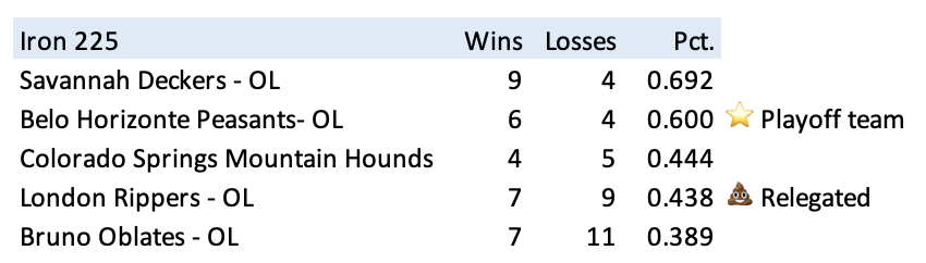 Coney Island wins the OL title Eden Prairie and Auckland make the playoffs but get knocked out in the wildcard round. Baltimore and Tampico are relegated.