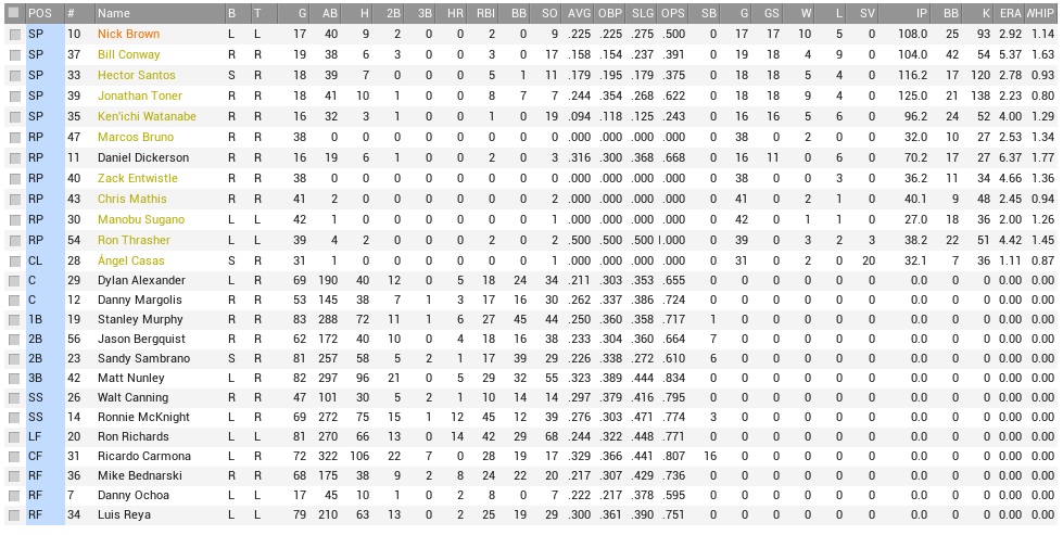 The Baybirds were in the thick of the playoff race, starting the week only one game back behind the Thunder in the CL South, but would get the Raccoons’ best three starters in this midweek set. Themselves they had a top three rotation that was weighed down by a crummy bullpen that ranked 11th in the CL. Overall they were fifth in runs scored and second in runs allowed, and they had won two of three from the Raccoons earlier in the season. Projected matchups: Hector Santos (6-5, 2.80 ERA) vs. Alex Maldonado (5-7, 3.79 ERA) Nick Brown (10-5, 2.88 ERA) vs. Joao Joo (9-4, 3.18 ERA) Jonathan Toner (10-4, 2.23 ERA) vs. Randy Farley (3-1, 2.87 ERA) Joao Joo, a 26-year old Venezuelan swingman, was the only left-hander we would get in the set. Joo had had merely marginal success in the rotation and in the pen in the last two-and-a-half years. He had never started against the Raccoons. Ronnie McKnight was not expected to play in this set. The Bayhawks had SP Juan Garcia and outfielder Will McIntyre on the DL, but both had gone down early in the season and it hadn’t hurt them so far. Game 1 SFB: 1B A. Young – RF J. Gusmán – LF Alston – CF D. Garcia – 3B J. Rodriguez – 2B A. Martinez – SS R. Miller – C A. Ramirez – P Maldonado POR: CF Carmona – 2B Sambrano – 3B Nunley – LF Richards – 1B Murphy – RF Reya – C Alexander – SS Hudman – P Santos Three guys with 15+ homers in the first four in the lineup, including Adam Young (.347, 16 HR, 76 RBI) leading off – this was not a lineup to joke around with. Antonio Ramirez and Adam Young hit singles in the third inning, but a foul bunt for strike three by Alex Maldonado and a foul pop by Javier Gusmán killed off the Bayhawks in that inning. The Coons were up 1-0 then after doubles by Reya and Hudman in the second, and Sandy Sambrano hit a solo homer just inside the right foul pole in the third inning to run the lead to 2-0. Dave Garcia had a leadoff single in the fourth, Santos threw a wild pitch to get him to scoring position, but Garcia was then caught trying to steal third base, which erased that little problem. On the other side of the middle of the fourth inning the Coons would hit three singles off Maldonado, loading the bases with one out – but Santos coming to the plate. He struck out, and Alston caught Carmona’s fly to left, ending the inning. Adam Young was soon ready to harm the Raccoons for their shoddy RISP batting, tying the game in the fifth with a 2-run shot. Maldonado was on first base then, having forced out Ramirez with another poor bunt. The power division remained online, and Dave Garcia cracked a solo shot in the sixth inning to put the Birds ahead, 3-2. While the Raccoons were remarkably ineffective at the plate, the Bayhawks would also turn on Zack Entwistle in the ninth, getting him for two runs, including a Javy Rodriguez homer. The Raccoons would be down 5-2 against Micah Steele in the ninth inning, but wonderously put up a sudden threat. Danny Ochoa drew a walk with one out, and with two outs Cookie hit a single to right. Ochoa scored on a wild pitch (how can anyone employ Steele as a closer!?) and Sandy hit a double to plate Carmona, representing the tying run for Nunley, who struck out. 5-4 Bayhawks. Sambrano 3-5, HR, 2B, 2 RBI; Reya 3-4; Hudman 2-3, 2B, RBI; I don’t know what frustrates me more. Entwistle, or that we have already fulfilled our season allowance in slams and thus can out-hit any team we want (11-9 in this case) and still come up getting barfed on. Joao Joo was removed from the middle game. The Bayhawks would send Jared D’Attilo (4-6, 4.14 ERA), another right-hander, instead. Game 2 SFB: 1B A. Young – 2B A. Martinez – LF Alston – CF D. Garcia – SS Ingraham – 3B J. Rodriguez – RF Zackery – C A. Ramirez – P D’Attilo POR: CF Carmona – SS Sambrano – 3B Nunley – LF Richards – 1B Murphy – RF Reya – C Alexander – 2B Bergquist – P N. Brown Brownie was 5 K away from 2,900 as he entered this start – this was coincidentally also the career mark of Hall of Famer Arnold McCray. He got three the first time through, but had to work hard and ran a few 3-ball counts and also issued a walk. Nobody scored until the fourth inning, when the Raccoons had runners on the corners with one out. Matt Nunley had led off with a single, but had been forced by Richards. Although Richards had no speed, he was told to go with Murphy the next double play threat, and his grounder to second base eluded Zach Ingraham. Ron Richards reached third. Luis Reya hit a ball to slightly deep left, Ron Alston made the catch, the throw in was poor, the relay arrived at the same time as Richards, who knocked over Ramirez and scored. D-Alex made the poor out he was known for to end the inning, 1-0 Coons. Big two-nine-hundred fell in the fifth. Brownie led off by whiffing the still shaken Ramirez, then also whiffed D’Attilo to reach the mark. He was still not exactly dominant. Ron Alston hit a hard 1-out single in the top of the sixth, but was caught up in a frankly stunning play by Murphy, who swiped a fast bouncer by Dave Garcia and turned it into a baffling double play. Brownie would hang another K, #2,902, on D’Attilo to complete the seventh inning, but had run three full counts in the inning and had ended up over 100 pitches. With the top of the order coming up in the eighth, Thrasher was called on; Young and Alston were left-handers. Those two whiffed, and in between Armando Martinez grounded out to Nunley. It was still a 1-0 game. And D’Attilo was still in it as we got to the bottom of the eighth. Ochoa hit for Thrasher to lead off, and dished a single through the left side of the infield. Cookie wrestled a full count walk from D’Attilo, putting two on. Sandy struck out, but Nunley grounded to right and past Martinez. Ochoa was sent on the single and scored easily, 2-0. Since the throw from Rusty Zackery went home, both runners advanced and the Coons had them on second