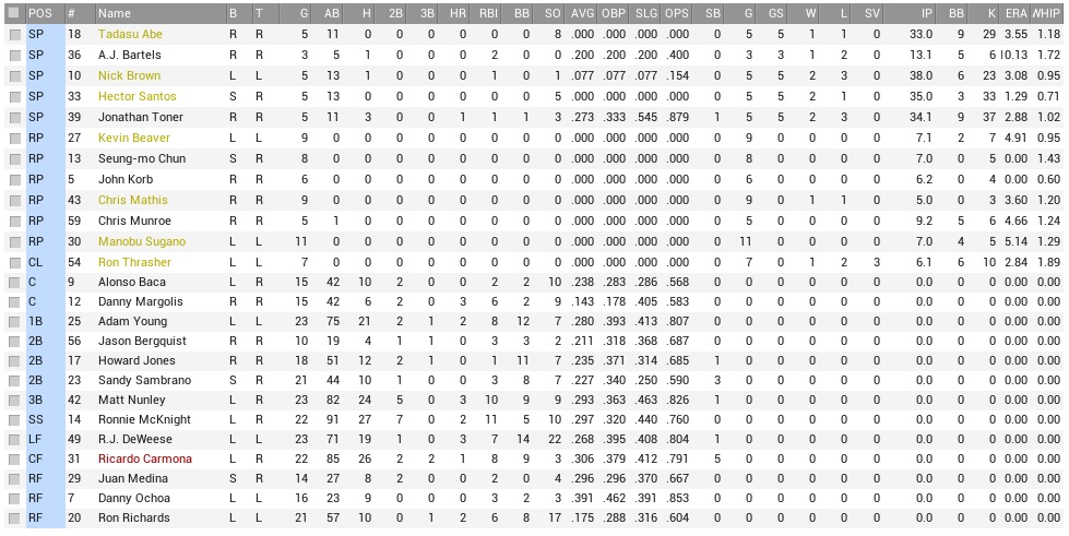 How exactly the Indians were the only winning team in the North right now was anybody’s guess, but I was quite sure that it wouldn’t last, one way or another. While the Raccoons were last in runs scored (…) and second in runs allowed, but with zero run differential, the Indians were t-2nd in runs scored, and actually were the only team with less runs allowed than the Critters. How exactly this had happened … oh well. The Coons had already been hopeless against the Indians in 2015, being pelted to a 5-13 rhythm, so there was probably not a lot of hope for this set, either. Projected matchups: Nick Brown (1-1, 2.25 ERA) vs. Josh Riley (1-1, 5.68 ERA) Hector Santos (1-0, 1.29 ERA) vs. Jason Clements (1-1, 1.69 ERA) Tadasu Abe (1-0, 1.80 ERA) vs. Alejandro Mendez (2-0, 2.53 ERA) Again three right-handers! And we will not get a southpaw on the weekend either – the Knights don’t have any. Game 1 POR: CF Carmona – SS McKnight – 3B Nunley – 1B A. Young – LF DeWeese – RF Richards – 2B Jones – C Margolis – P Brown IND: CF J. Wilson – RF Gilmor – C Padilla – 1B S. Guerra – 2B Tolwith – SS Mathews – LF D. Young – 3B Dawson – P Riley The Critters took a lead in the oddest way they knew in the top of the second, when Adam Young scored on Ron Richards’ triple into the rightfield corner. The lead didn’t hold up, since Joey Mathews hit an RBI double past Carmona’s reach in the bottom of the inning, chasing home the always annoying Aaron Tolwith, Nick Brown’s special friend when he was with the Loggers* and who had singled earlier. The Indians led the league in offense, and were keen on defending that spot, while the Raccoons would soon again show the ****ty defense that had put them at the bottom of that table in the first half of the last season. The Indians in the bottom 3rd got going on an infield single by John Wilson with one out that I was blaming on Howard Jones. Nick Gilmor then hit a double that was close to a bloop and on which DeWeese and Carmona looked another off. Wilson scored. Brownie, already knowing he had lost about an inning ago, hit Dave Padilla, and Santiago Guerra singled to load the bases. Tolwith hit into a force play at home plate, but Joey Mathews plated another two runs with a liner into the leftfield corner before the Raccoons threw out Tolwith at third base. That put the Raccoons down 4-1, and given their previous track record this season, the damage was certainly fatal. The only Critter to reach base in the middle innings was Adam Young, once on a walk, and once with a homer. That was of course a solo shot and still left Brown trailing, 4-2 after six. Brown held out seven and a third innings, while the previously battered Riley went eight. The Raccoons managed only one more base runner, Howard Jones with a single, before silently expiring. 4-2 Indians. Young 2-3, BB, HR, RBI; Brown and Tolwith were ejected and suspended a number of years ago for inciting a brawl. Elsewhere, the Crusaders/Loggers game was rained out. The Crusaders have now played one game in the last four days. The Indians skipped Clements and sent Mendez into the Wednesday game. Game 2 POR: CF Carmona – SS McKnight – 1B A. Young – LF DeWeese – 3B Nunley – RF Medina – 2B Jones – C Baca – P Santos IND: LF J. Baker – CF J. Wilson – 1B S. Guerra – RF Gilmor – C Padilla – 2B Mathews – SS Dawson – 3B Tolwith – P A. Mendez Both teams had 1-out doubles in the first inning, but only the Indians used a groundout by Nick Gilmor to score a run. In all fairness, Santos had started his day with drilling Josh Baker, which was not helping his cause much. It was an odd game for Santos, who allowed sufficiently hard contact to be scared rather frequently, including all three batters in the bottom 2nd, Mathews, Ryan Dawson, and Tolwith, but the Indians always seemed to find an out, and Santiago Guerra’s first-inning double remained their only hit through five innings. The Coons had two hits by then, and zero runs, having stranded pairs of runners twice via the strikeout; Nunley in the first, and DeWeese in the third. The Arrowheads didn’t get another hit until the sixth, but then got back-to-back 1-out singles from Baker and Wilson and scored another run on Guerra’s fly out (like one run wasn’t enough…). Padilla, Mathews, and Dawson would open the bottom 7th with singles off Santos, all of them more or less soft and barely getting past the infield dirt, of ****ing course, and while Apasyu Britton hit into a double play, that still scored another run. Up 3-0, the Indians forewent hitting for “Ant” Mendez, who flew out to DeWeese. What could possibly happen with six outs left? Danny Ochoa opened the inning, batting for Santos, and singled to right center before quickly getting forced out by Carmona. Cookie went on to steal second base, then scored on McKnight’s double to left. Suddenly, the tying run was up! Adam Young cranked an 0-1 pitch into right, a single, and suddenly the go-ahead run appeared in R.J. DeWeese, and still no movement to collect Mendez from the home team. DeWeese hit a looper up the rightfield line for an RBI single, 3-2, before Nunley bounced back to Mendez, who got only DeWeese at second base, with runners on the corners for Sandy Sambrano and two outs. Still no relief in sight, and Sambrano rolled a ball right into Mendez’ glove to end the inning. The hardest harvest was instantly given back to the Indians by Kevin Beaver, who allowed a double and hit a guy, and Seung-mo Chun, who was quite simply no help and allowed another two hard-banged hits, and the Raccoons lost another reason for why there was a huge market for antidepressants. 5-2 Indians. McKnight 2-4, 2 2B, RBI; Young 3-4; Ochoa (PH) 1-2; The only reason we’re currently not last in the North is that we haven’t lost a sufficient number of games due to three off days and the dreaded and famous New York monsoon season. And I thought Portland was