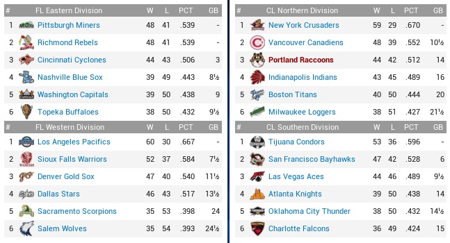 This was our first series against the Loggers in 2016, and it would be for four games. They had lost seven straight games (much opposing the Raccoons’ 5-game winning streak), allowing the most runs (5.9 per game!), which was an amount of raging failure on the mound that even the third-best offense in the league couldn’t possibly pick the slack up for. After beating them up 16-2 two seasons ago, the Raccoons had merely won 11 of 18 from them in 2015, so there was some pace to gain on what had last week rapidly become the worst team in the Continental League (by record). Projected matchups: Nick Brown (3-4, 3.00 ERA) vs. Joey Van Buskirk (0-0, 3.27 ERA) Hector Santos (3-1, 1.51 ERA) vs. Michael Foreman (0-2, 4.72 ERA) Tadasu Abe (2-2, 3.47 ERA) vs. Brian Cope (2-2, 4.35 ERA) Chris Munroe (1-1, 2.20 ERA) vs. Jason McDonald (2-6, 6.20 ERA) Only right-handed starting pitchers for the Loggers, and they only have one reliever. Odd things happenin’: the Loggers ranked 6th/5th/4th in team slashing in the CL, but had the third-most runs. The Critters ranked 7th/6th/7th and had the least runs. Also, with the streaks going on, Van Buskirk will DEFINITELY fire a shutout in a 13-0 blowout over Brownie’s soon-to-be-dead corpse. Game 1 MIL: RF Hodgers – SS Howell – LF Dally – 1B M. Rucker – 2B Enriquez – CF Cooper – C Griffen – 3B I. Reed – P Van Buskirk POR: CF Sambrano – SS McKnight – 3B Nunley – 1B Young – LF DeWeese – RF Richards – 2B Jones – C Margolis – P Brown Two walks and a McKnight single loaded the bases with no outs right in the first inning for the Critters, and at first it looked like the precious middle of the order would only have salad rather than take in some steak. Adam Young flew out to shallow center in a way that kept everybody pinned, and when DeWeese flew out to right, that also only got Sambrano home. However, power came from an unlikely source, and Ron Richards smashed a fastball outta rightfield for a 3-run homer, giving Brown a quick 4-0 lead. For Van Buskirk, the bleeding would never really stop and he allowed single runs in the next two innings before being removed from the game before Brownie ever gave up a hit. Tom Nelson was in for the bottom 4th, but allowed a run before he retired anybody. McKnight reached, Nunley reached, and Young singled home McKnight, 7-0. That was all in the inning because DeWeese flew out again and Richards hit into a good ol’ double play, and the top 5th started with an infield single for Victor Enriquez, the first Logger to reach on his own merit in the game (Brown had drilled Rob Howell in the first inning), and he was soon brought around to score on two more singles. Tony Harrell did the impossible and pitched a scoreless inning for the Loggers in the bottom 5th, but the Coons would be all over him in the sixth, as McKnight, Nunley, and Young again opened a frame by reaching base as a group, all with singles, plating McKnight and putting runners on the corners for DeWeese, who was 0-for-2 and angry, and utterly exploded a 3-1 fastball for a massive 410+ footer to right center, blowing the score to 11-1! One more run would be scored in the eighth inning after an Ochoa triple and a Margolis single. Brownie was also done after eight, throwing almost 110 pitches, and Juan Gallegos was tasked with tending to an 11-run lead. No Logger reached base on his watch. 12-1 Brownies!! McKnight 4-5, RBI; Nunley 2-3, BB, 2B, RBI; Young 2-3, BB, RBI; Ochoa (PH) 1-1, 3B; Margolis 2-5, 2 RBI; Brown 8.0 IP, 4 H, 1 R, 1 ER, 0 BB, 8 K, W (4-4) and 2-4; Yikes, offense! Still last in runs scored, though. Our previous season high in terms of runs in a game had been eight, achieved twice overall and once in a loss. Game 2 MIL: C T. Delgado – SS Howell – LF Dally – 1B M. Rucker – 2B Enriquez – CF LeMoine – RF Cooper – 3B I. Reed – P Foreman POR: CF Sambrano – SS McKnight – 3B Nunley – 1B Young – LF DeWeese – RF Richards – 2B Jones – C Margolis – P Santos After last night’s blowout, the Loggers scored in the first inning against the CL ERA leader Santos, although the run was unearned after Nunley airmailed Justin Dally’s grounder for a 2-base error that allowed Tony Delgado to score unimpeded from second base after a leadoff double. An unearned run in the bottom 1st then tied the game. Andrew Cooper botched the pickup on R.J. DeWeese’s single to right, allowing McKnight to scamper home rather than stop at third base after hitting a double himself. Another error on Michael Foreman loaded the bases in the bottom 2nd. He had thrown wildly past Isiah Reed when fielding Santos’ bunt with Richards and Margolis on base, which admittedly added up to zero speed, but that throw was still horrendous. Bases loaded with one out for Sandy, who was eager to do damage after another so-so start to this season, was close to striking out, but was then smacked by Foreman, which shoved home Ron Richards with the go-ahead run, 2-1. Three more runs would score in the inning on a groundout by McKnight, a single by Nunley, and finally a wild pitch before Young popped out over home plate to end the inning, with the Coons ahead 5-1. The bases were loaded yet again in the bottom 3rd after a walk to Richards and two singles by Jones and Margolis, but with one out it was Santos to bat. He was a career .177 batter that had started this season 0-for-18, so there was not much to expect. He struck out, and Sambrano followed him, head down low back to the dugout. The Loggers had yet to concede defeat, however, and weren’t going to for a while. They had the game tied before Santos could count his strikeouts, plating two in the fourth on a walk to Justin Dally and an Enriquez triple with subsequent sac fly by Chris LeMoine, and scored two more in the fifth to get even at five, with Dally hitting a 2-out, 2-run double to tie the game. Foreman was already out of the game, which could only be good for Milwaukee, but Santos was