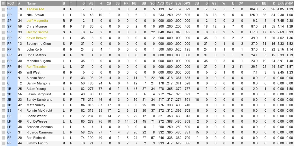 Raccoons (11-18) vs. Cyclones (14-16) – May 10-12, 2016 The Cyclones ranked fifth in both runs scored and runs allowed with a +12 run differential, so they were probably also due for some better luck. What better time to start a winning streak as against these Critters? The Raccoons had not played the Cyclones since 2013, when they had taken two of three games from them. Projected matchups: Jonathan Toner (2-4, 3.89 ERA) vs. Shunyo Yano (2-4, 4.70 ERA) Nick Brown (2-4, 3.60 ERA) vs. Ricky Mendoza (3-2, 4.79 ERA) Hector Santos (3-1, 1.76 ERA) vs. Graham Wasserman (1-2, 2.01 ERA) Game 1 was to feature something special – a matchup of pitchers that had been traded for another! Since then, Yano had won 41 games for Cincy, so it’s not like they had gotten no stick at all (just the shorter one), but I’d hold onto Jonny Toner’s stick firmly when comparing those two. Now let’s watch him get blown out for eight runs while Yano spins a shutout. It would fit this rotten season. Of course that’s not the only former Raccoon we’re going to face. Wasserman was ravaged to a 5.98 ERA last season, but seemed to have turned thing around so far in 2015. He was now 25 and due for a decent output. We would not see a southpaw in this series. And of ****ing course Jason Seeley is hitting .344 with four homers for them as a regular centerfielder oh my god I will have to kill myself right now kill me kill me kill me – Game 1 CIN: 1B L. Velazquez – LF R. Hernandez – C Jolley – RF Fullerton – 2B C. Martinez – CF Seeley – SS P. Morrison – 3B Moreno – P Yano POR: SS McKnight – 2B Jones – 3B Nunley – 1B Young – LF DeWeese – CF Medina – RF Richards – C Margolis – P Toner Toner managed to allow a triple, two singles, and smack a guy with his first ten pitches, which put him down 1-0 with the bags full and nobody out. Carlos Martinez’ K and Seeley’s pop raised hopes for a mild outcome with the (thin) home crowd, but Pat Morrison hit another single to right center (all singles dropped right in front of Ron Richards) and the Cyclones went up 3-0, at which point the game was more or less over. What really hurt was the pair of hits that Yano would have in his first two plate appearances, including a rocket double to lead off the second, though he didn’t score, because it only showed that Toner somehow had lost all his stuff over the winter and was merely cooking with water. Also, Seeley tripling and scoring in the sixth, which made me take another bite out of the edge of my desk. While Toner had lined up four zeroes in between despite two leadoff hits (including Yano’s), the Raccoons’ offense was once again and just as always mostly / completely absent. DeWeese hit a dumb-luck triple in the bottom 2nd and scored on Ron Richards’ sac fly. While he was sucking so bad that even a lowly sac fly was a step in the right direction for him, it got the Raccoons nowhere specifically. They amounted to three hits and three walks against Yano in eight innings, and were quickly quelled by Juan Jimenez come the ninth. 4-1 Cyclones. Three hits, three walks, and not once did a Raccoon reach base with a Raccoon already on it. They are truly a royal pain. Next, Nick Brown’s I-bet-this-won’t-work next bid for 3,000 strikeouts. He needs four, and things have been rough. Game 2 CIN: RF Fullerton – SS Dahlke – C Jolley – 3B C. Martinez – 1B J. Ortíz – CF Seeley – LF L. Velazquez – 2B P. Morrison – P R. Mendoza POR: 2B Sambrano – SS McKnight – 3B Nunley – 1B Young – LF DeWeese – CF Medina – RF Richards – C McNeela – P Brown Brownie struck out Jayden Jolley to end a perfect first, then even got a lead in the bottom of the inning. Sandy singled, stole second, scored on Young’s liner to left center. This also gave Adam Young (110+ RBI for three straight years…) 13 RBI for the season, which broke a tie for the team lead, goddamnit. Juan Ortíz struck out in the second, and after Pat Morrison grounded out to start the third, Brownie victimized the pitcher Ricky Mendoza, reaching 2,999. The attendance (still sparse, but with this social media fad that’s going on everything a pitcher does will be on Foolbook in a matter of minutes anyway, so why bother to attend in 44 degrees and a biting wind?) was up and clapping when Brown got D.J. Fullerton to 1-2. Fullerton flailed at a pitch that almost hit him in the foot to end the inning, and the scoreboard in left center went completely nuts. All the colors! This being Nick Brown’s 3,000th strikeout, both teams poured out of their dugouts if not already on the field to hug and pat him between innings. Up in my office, I cried like a bitch. While we had some vintage Brownie on the mound, allowing only three hits against eight strikeouts in the first five innings, the offense was as usual. They had runners in scoring position after McKnight and Nunley had hits in the bottom 3rd and were stranded there when Young flew out easily. The next inning DeWeese was caught stealing one pitch before Juan Medina doubled to right, with Medina eventually starved at third base. Brownie erased the top of the order with strikeouts to Fullerton and Jolley to reach 10 K through six, before the Coons had a huge scoring opportunity in the bottom of the inning. Adam Young led off with a walk before DeWeese doubled to right center. Young held, but now we had them on second and third with no outs! Insurance runs, insurance runs! Medina smacked a liner to right that Fullerton caught with a panicked Young scampering back to third base. Ron Richards was only batting .194 but was walked intentionally anyway to bring up Tom McNeela, who had amassed the grand total of 1 (one) RBI in the last four seasons. He lashed a pitch to left center, Seeley closed in on it but couldn’t get it, and it bounced to the track for a 2-run double!! Brownie hit an RBI single, and Sandy hit a run-scoring infield single before McKnight hit into a double play