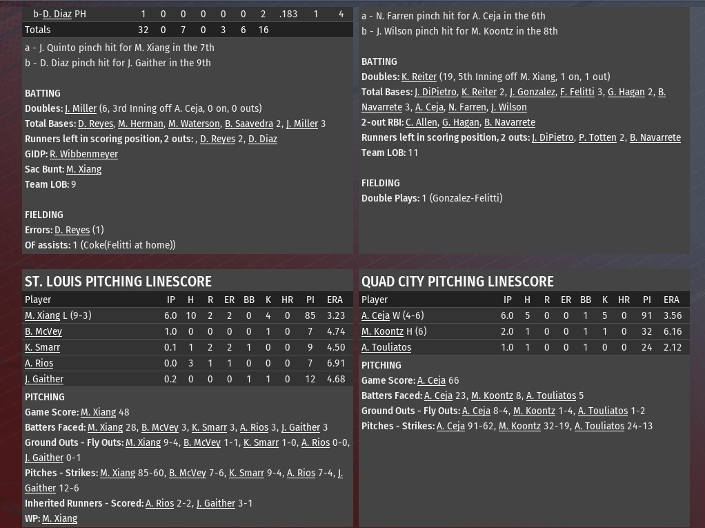 Antonio Ceja handled the first six innings, and the Quad City bullpen did the rest as the Thunder shutout St. Louis 5-0 in both teams' first game after the All-Star break at Fenway Park (1976). Ceja (4-6) scattered five hits (four singles and a double) during his time on the mound. He struck out five and walked one. Mike Koontz pitched a pair of innings of scoreless relief. Angelo Touliatos followed suit in the ninth. Quad City jumped out to a 2-0 lead with a pair of runs off River Walkers starting pitcher Ming Xiang in the bottom of the second. Jacob Gonzalez led off with a single and moved to second on a wild pitch. Gonzalez scored on a two-out single by Gabriel Hagan, with Gonzalez taking second on the throw to the plate. Bruce Navarette made it 2-0 with the third single of the inning. The Thunder did the rest of their scoring in the bottom of the eighth against the St. Louis bullpen. QC wrapped out four hits (all singles) in the inning and also drew two walks. Navarette drove in the first run with a single off Alex Rios. Jesse Gaither walked Collin Allen with the bases loaded to make it 5-0. |