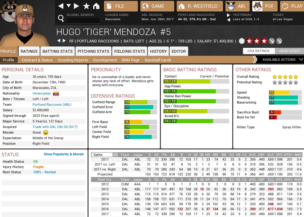 Raccoons (40-27) @ Indians (44-22) – June 16-18, 2017 The Indians were quite good, and that was an understatement. Although I was yet not certain how they had gotten to second place in runs scored and being tied for first in runs allowed (with the Critters), the resulting +99 run differential certainly made them appear legit in the middle of June. Their rotation was the best in the league, while their pen was second-best, and they also led the league in batting average. Despite this, so far the Raccoons had the leg up in the season series, having taken three of four games in the first meeting between the teams. Projected matchups: Tadasu Abe (6-6, 2.94 ERA) vs. Alejandro Mendez (10-3, 1.81 ERA) Bruce Morrison (5-6, 3.64 ERA) vs. Dan Lambert (8-5, 2.79 ERA) Jonathan Toner (9-2, 1.46 ERA) vs. Josh Riley (7-4, 3.76 ERA) This is three right-handers, although they had an off day and could skip Riley in favor of the southpaw Tristan Broun (10-2, 3.16 ERA) on Sunday. Since Nick Brown had yet to make his rehab start in St. Petersburg and wouldn’t be ready for a turnaround on Monday, we’d see another glimpse of Damani Knight then. Ronnie McKnight enters with a 10-game hitting streak. Game 1 POR: CF Carmona – 2B Walter – 3B Nunley – LF DeWeese – SS McKnight – C Margolis – RF Ochoa – 1B A. Young – P Abe IND: CF J. Wilson – SS Matias – LF Genge – 2B Kym – RF Gilmor – C Padilla – 3B Mathews – 1B S. Madison – P A. Mendez Despite only an infield single allowed to Shane Walter in the first three batters, “Ant” Mendez caught some unexpected flak in the first inning, allowing three straight 2-out singles to the 4-5-6 batters, amounting to two runs for the Critters. A good start to the series for sure, but unfortunately Abe created a lot of nervousness around our dugout thanks to allowing a lot of base runners. The Indians appeared to have him in the bottom 3rd when Mendez lined sharply past Young and was followed by John Wilson, putting the tying runs on with one out, but Abe got out by retiring Raul Matias and Lowell Genge. In the bottom of the fourth, Jong-beom Kym and Nick Gilmor led off with singles, and Steve Madison loaded the bases with another single to right with two outs, but that brought up Mendez again, and this time he struck out. After the early pair of runs, the Raccoons had fallen a bit silent, landing only one base hit in the next three innings, but to start the fifth they suddenly hit liners all over the place. Cookie opened with a double to deep left and scored on line drive singles by Walter and Nunley, 3-0. DeWeese loaded them up with a grounder into centerfield, and no outs! The Indians only got the out at second base when McKnight grounded to Matias, allowing another run to score, but Mendez then escaped whiffing Margolis and getting some support from Genge in retiring Ochoa, who sent a fly to fairly, but not dangerously deep left. Leadoff singles for the Indians in the bottom 6th and 7th were both times erased with double plays, and Abe ended up arriving in the ninth inning unscathed and having thrown exactly 100 pitches through eight. Kym led off the inning, had two leadoff singles in the game, and landed his third one, a soft loop into right center for another single. While Gilmor got him forced with a grounder, Dave Padilla singled quite determinedly to left, and that was the end for Abe, with the tying run appearing in the on-deck circle. Alex Ramirez was called on, and casually filled the bases with another single hit by Joey Mathews. Bartolo Román hit for Madison, but struck out, and then unheralded Josh Malone hit in the pitcher’s spot. His first-pitch grounder went right to Young for the final out. 4-0 Raccoons. Walter 2-5; DeWeese 2-5, RBI; Abe 8.1 IP, 9 H, 0 R, 0 ER, 1 BB, 9 K, W (7-6) and 1-4; McKnight has an 11-game hitting streak, the Coons have a 7-game winning streak, and we also should mention the 13-game hitting streak for Jong-beom Kym, although we were actively trying to end it. Game 2 POR: CF Carmona – 2B Petracek – 3B Nunley – LF DeWeese – C Denny – SS McKnight – RF Waggoner – 1B A. Young – P B. Morrison IND: CF J. Wilson – SS Matias – LF Genge – 2B Kym – RF Gilmor – C Padilla – 3B Mathews – 1B S. Madison – P Lambert Again the Critters scored early; Cookie opened the game with a bloop double to right, and after an infield single for Petracek they were on the corners. Nunley plated Cookie with a sac fly, although it would take three more batters to get McKnight home, who hit a 2-out RBI single to score Petracek for an early 2-0 edge, although that 2-0 edge soon enough didn’t look like it could save Morrison from his follies. The Indians had the bases loaded as early as the second inning, though a Petracek error was instrumental in one of the runners reaching. With the bags full and one out, Madison struck out in a full count before Lambert bounced out to his opposite, Morrison. The Arrowheads weren’t denied much longer, though. John Wilson hit a leadoff double to left in the bottom 3rd, and with Morrison’s general lack of stuff it was not possible to keep him on. Genge plated him with a groundout, 2-1. The Raccoons would have the bases loaded with nobody out in the fourth after leadoff singles by Denny and McKnight, and Waggoner drawing a walk. Young, the sucker, struck out, and Morrison hit into a double play to score nobody. It was little consolation that Steve Madison also hit into an inning-ending double play (with two runners on base) in the bottom 4th, and that the home team left the bases loaded again in the bottom 5th. They had loaded the bases in the first place with zero hits, Morrison walking Wilson and Kym and plunking Matias in between. Gilmor flew out to DeWeese to end the inning. After a clean sixth we felt like we had tempted fate enough. Ochoa hit for Morrison in the top 7th, grounded out, and while Cookie hit a 2-out double afterwards, Lambert whiffed Petracek to