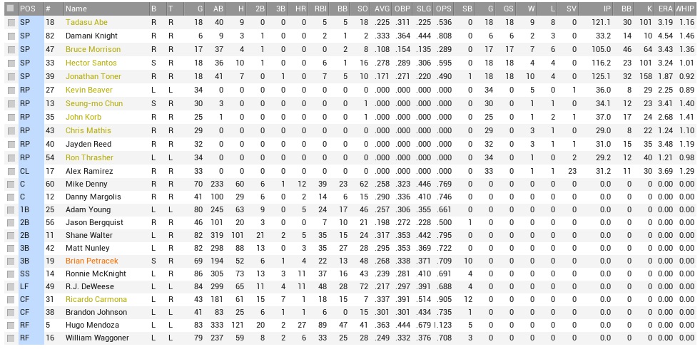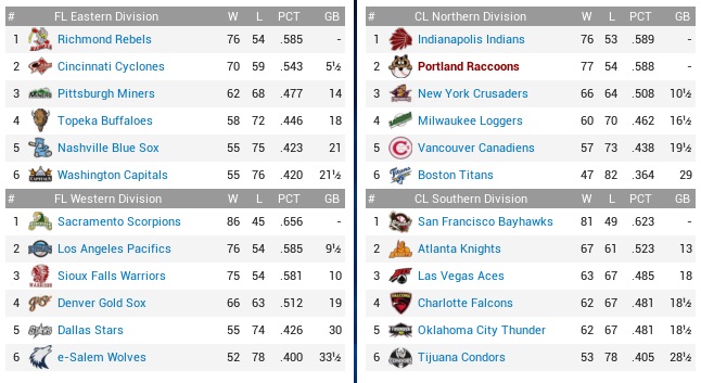 25 1/2 games out, the Titans were miserable. The worst product in the league when it came to keeping the opposing team off the scoreboard, they had conceded 503 runs, more than 5.5 per game. Their offense was eighth, and their run differential had plunged into negative triple digits at -106. Right now, they also had a few outfielders including Jonathan Blake on the DL to make their lineup even worse than it was. The Coons so far had taken a 6-3 lead in the season series. Projected matchups: Tadasu Abe (10-8, 3.16 ERA) vs. Chris Klein (5-11, 6.04 ERA) Hector Santos (5-4, 3.04 ERA) vs. Jose Fuentes (3-8, 5.07 ERA) Jonathan Toner (12-4, 1.86 ERA) vs. Alfredo Collazo (0-2, 8.59 ERA) We skipped Damani Knight, because the week started with an off day, and I can’t bear him. They are sending three right-handers, and let’s see how this affair of Johnny facing another pitcher with four times his ERA will go… Game 1 POR: CF Carmona – 2B Walter – 1B Mendoza – LF DeWeese – 3B Nunley – C Denny – SS McKnight – RF Johnson – P Abe BOS: CF Mata – 2B M. Rivera – 1B S. Butler – C T. Robinson – RF Branch – 3B T. Thomas – LF X. Williams – SS Vasquez – P Klein A small and disillusioned crowd got kicked in the groin early as Klein, who had significantly more walks than strikeouts, got Cookie to fly out to Xavier Williams to start the game, but was then burned for a 4-spot. After Walter and Tiger singled, DeWeese hit an RBI double and Nunley hit a 3-piece to right center to give Abe an early cushion. Klein’s nightmarish control was also on display early. He issued five walks by the third inning, which included three walks to load the bases in that third inning, which brought up Brandon Johnson with one out. Johnson popped out and Abe lined out softly to Mike Rivera to end the effort. While Abe retired the first 11 Titans before Steve Butler doubled (but was left on), Klein walked six in his start and despite the early shelling reached the sixth inning, where he was finally knocked out after a 2-out single by Tiger and a subsequent double by DeWeese, which added a run for a 5-0 score. Former Critter Kenichi Watanabe replaced Klein, and he did not have a better ERA… He would pitch into and out of trouble in the seventh and eighth, the Coons stranding pairs in both innings, but at least Abe was still running a 2-hitter … until he didn’t. Tom Thomas opened the bottom 8th with a double and suddenly Xavier Williams unloaded a homer to right center that brought the Titans back to 5-2. Abe got one more out before being replaced by Thrasher, who ended the inning. Given the flock of left-handed bats that the Titans had in their lineup and Alex Ramirez’ infinite struggles, Thrasher was left in for the ninth, but allowed two hits before he got two outs, then threw a wild pitch. Ezra Branch grounded out to short, which allowed Rivera to score, but Tom Thomas struck out to end the game without Ramirez having to come into a hot mess. 5-3 Coons. Walter 3-5, 2B; Mendoza 2-5; DeWeese 2-3, 2 BB, 2 2B, 2 RBI; Nunley 2-5, HR, 3 RBI; Abe 7.1 IP, 4 H, 2 R, 2 ER, 1 BB, 4 K, W (11-8); For the middle game, the Titans decided to give Eric Rasmussen another shot at starting, having last pitched before the All Star break. He was 1-6 with a 4.84 ERA, so no significant improvement over the other guys. Game 2 POR: CF Carmona – 2B Walter – 1B Mendoza – LF DeWeese – 3B Nunley – C Denny – SS McKnight – RF Waggoner – P Santos BOS: CF Mata – 2B M. Rivera – 1B S. Butler – C T. Robinson – RF Branch – 3B T. Thomas – LF X. Williams – SS Vasquez – P Rasmussen The Raccoons left Mike Denny on third base after a second-inning triple(!), then had Walter and Nunley kill the next two innings with double plays while the Titans took an early 1-0 lead on a Thomas double and Williams single. Santos inexplicably added two walks to a 1-out Alex Mata single in the bottom 3rd, but got out when he played Ezra Branch’s grounder himself for the third out. He also walked Williams in the fourth, but Denny picked him off. A decently sized rain delay got Santos out of the game after five innings, but maybe the Coons could at least spare him the loss; Cookie at least led off the top 6th with a double to right and moved to third on Walter’s groundout. Tiger hit a ball JUST past Rivera for a game-tying single, then was caught stealing (like Waggoner had been caught the previous inning). Chun put runners on the corners in the bottom 6th before Beaver had to come out with Williams being the first of the long string of left-handed batters that ran from the bottom to the top of the order. Williams hit a drive to deep center anyway, but Cookie threw himself in harm’s way to get that defused and keep the game tied. It didn’t remain tied for long. Jasper Holt pinch-hit for Robbie Vasquez to start the bottom 7th. He was a right-hander, we weren’t falling for that, and Holt doubled. It could hardly get worse, except that Mathis appeared with one out and allowed three singles and a wild pitch before the inning ended on a grounder that happened to find Walter, but by then two runs were across. The Coons would load the bases in the top of the eighth against southpaw Matt Branch, who walked two and brushed the Tiger, which unfortunately meant that DeWeese batted with two outs. He hit a ball, but he hit it softly and right to Steve Butler to end the inning. Nobody reached against Harry Merwin (even their closer had almost as many walks as strikeouts!) in the ninth. 3-1 Titans. But to be fair, Raccoons pitching in this game also walked more (5) than they struck out (4)… Game 3 POR: CF Carmona – 2B Walter – RF Mendoza – LF DeWeese – 3B Nunley – SS McKnight – 1B Young – C Margolis – P Toner BOS: CF Mata – 2B M. Rivera – 1B S. Butler – C T. Robinson – RF Branch – 3B T. Thomas – LF X. Williams – SS Vasquez – P J. Fuentes Fuentes was the third Titans starter in the series to