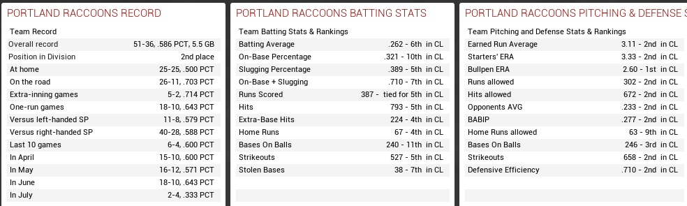 Raccoons (47-32) vs. Loggers (36-42) – June 29-July 2, 2017 The Raccoons were 5-3 against the Loggers this season. Milwaukee was sixth in both runs scored and runs allowed with a -1 run differential, but they were playing worse than that. One thing might be their bottomless bullpen, the second-worst in the league, that was actively harming them. Projected matchups: Jonathan Toner (9-3, 1.88 ERA) vs. Victor Scott (6-4, 2.89 ERA) Hector Santos (4-4, 3.47 ERA) vs. Ricky Mendoza (8-2, 4.29 ERA) Tadasu Abe (8-7, 2.94 ERA) vs. Michael Foreman (2-11, 3.88 ERA) Damani Knight (2-2, 4.34 ERA) vs. Luis Guerrero (2-7, 4.58 ERA) The Loggers will have left-handers at either end of this series. We are also in terrain where we might give the regulars a breather in this series, in order to have everybody ready for the important Crusaders tilt afterwards. McKnight would take a seat in the opener, which left our starting outfield and Shane Walter as guys to give rest to during the series. Game 1 MIL: RF Hodgers – 3B Landeros – LF LeMoine – SS Konrath – 2B Best – CF Gore – C Porter – 1B Betancourt – P V. Scott POR: CF Carmona – 1B Petracek – RF H. Mendoza – LF DeWeese – C Denny – 3B Nunley – SS Walter – 2B Bergquist – P Toner Maybe it was the sudden challenge to his top dog status (at least where career credentials were concerned; he certainly wasn’t the top dog on the team even without Mendoza), but all of a sudden R.J. DeWeese was doing real damage to opposing teams. He drove in the first four runs for the Coons against Victor Scott, who only went five innings and allowed as many counters. DeWeese hit a 3-run homer in the first, plating Petracek, who had walked, and Mendoza, who had singled, then hit an RBI single in the third inning, plating Petracek again as the same three guys hit three singles to get going. Jonny Toner allowed no hits until Steve Best hit a bloop single in the fifth, but hit a triple himself in the bottom 4th, scoring on a wild pitch, 5-0. Jonny found no great challenge in the Loggers order and whiffed ten by the seventh inning, in the bottom of which the Raccoons turned reliever Jimmy Young inside out. Mike Denny hit a 3-run homer to extend his hitting streak to 15 games, and they scored four runs total in the inning. Although his pitch count ran high at the end after two full counts in the eighth inning that ended in strikeouts anyway, Jonny pitched a quick ninth to claim a shutout on 121 pitches. 9-0 Coons! Mendoza 3-4, 3B, RBI; DeWeese 2-3, BB, HR, 4 RBI; Nunley 2-4; Toner 9.0 IP, 1 H, 0 R, 2 BB, 12 K, W (10-3) and 1-4, 3B; This was Jonny’s first shutout this year and the 10th of his career. Also, the recent scoring surge has catapulted the Critters to sixth place in the Continental League in terms of runs put on the board. Cookie and Shane Walter were given days off in the Friday game. Bergquist started at second, and after an 0-for-4 on Thursday sat squarely behind the eight ball. Never mind the total lack of qualified batters in our minor league system. Game 2 MIL: 3B Landeros – 2B Aponte – LF LeMoine – CF Cooper – SS Konrath – C O. Castillo – RF Gore – 1B Betancourt – P R. Mendoza POR: 3B Nunley – CF Petracek – 1B H. Mendoza – LF DeWeese – SS McKnight – C Denny – RF Waggoner – 2B Bergquist – P Santos Hugo chugged a 370-footer off Ricky in the bottom of the first to extend his own hitting streak to 15 games and put the Coons up 1-0, but Santos wouldn’t hold on to it at all. David Betancourt had the third single of the inning with one out in the top 2nd, tying the game, but Santos still would have gotten out of it relatively unscathed if he hadn’t spiked the throw to first on Mendoza’s grounder. Our own Mendoza couldn’t come up with it, and the Loggers took a 2-1 lead on the error, then extended it to 3-1 when Ruben Landeros hit a sac fly to right. Santos made another bad play in the fifth with a poor throw on Guillermo Aponte’s grounder, which then put runners on the corners following a Landeros double into the left corner, but a K to Chris LeMoine and a foul pop by Andrew Cooper bailed him out. With Santos almost at 100 pitches through five shoddy innings, the rest of the team were still soul-searching. When Bergquist singled with one out in the bottom 5th, Young hit for him, but popped out to short. Nunley fouled out, ending the inning, but things got definitely better in the next inning. Denny singled to extend his streak to 16 games, but before that even, DeWeese had drawn a 2-out walk and McKnight had smacked a jack to right to knot the score at three. John Korb, in his second inning, got ruffled in the top 7th, though. Victor Hodgers opened the frame with a pinch-hit single in Betancourt’s spot, stole second base and finally scored on another Landeros double (wonder where that was coming from…). Ron Thrasher replaced him to keep the deficit to a run, which he succeeded in. McKnight grounding to short with runners on the corners and one out in the bottom 8th looked like sealing one of those sad losses, but he actually beat out Aponte’s relay throw to break up the double play, which allowed Petracek to score with the tying run, then getting us even at four. Unfortunately, Hodgers continued to wreak havoc and hit a leadoff jack off Jayden Reed in the top 9th, putting the Coons in the hole for the third time, and they clambered out a THIRD time, and again Petracek had a hand in the comeback. Troy Charters allowed a leadoff walk to William Waggoner in the bottom 9th, after which Cookie hit for Bergquist and popped out to shallow center. Margolis hit for Reed, singled, but Nunley whiffed to get to 0-for-5. Petracek was up, hit a 1-0 pitch hard to left, where it fell in. Hodgers hurled it in; Cameron Konrath had his back to the plate and wouldn’t get Waggoner, but Margolis hadn’t looked left and made for third, where he was totally dead on Konrath’s short throw, but not until after Waggon