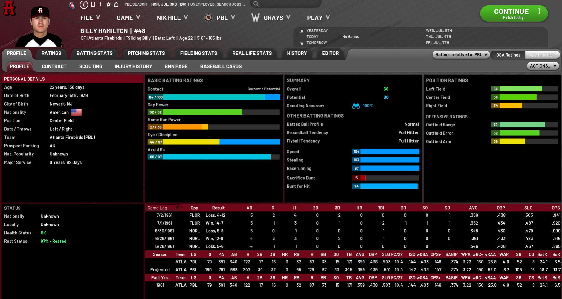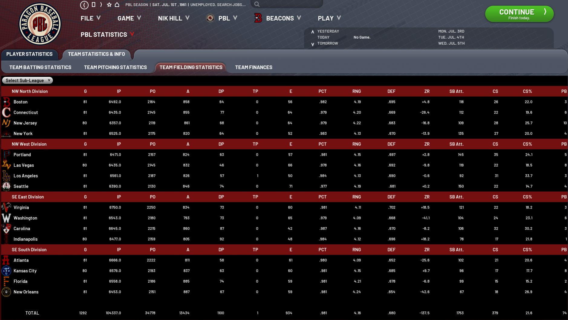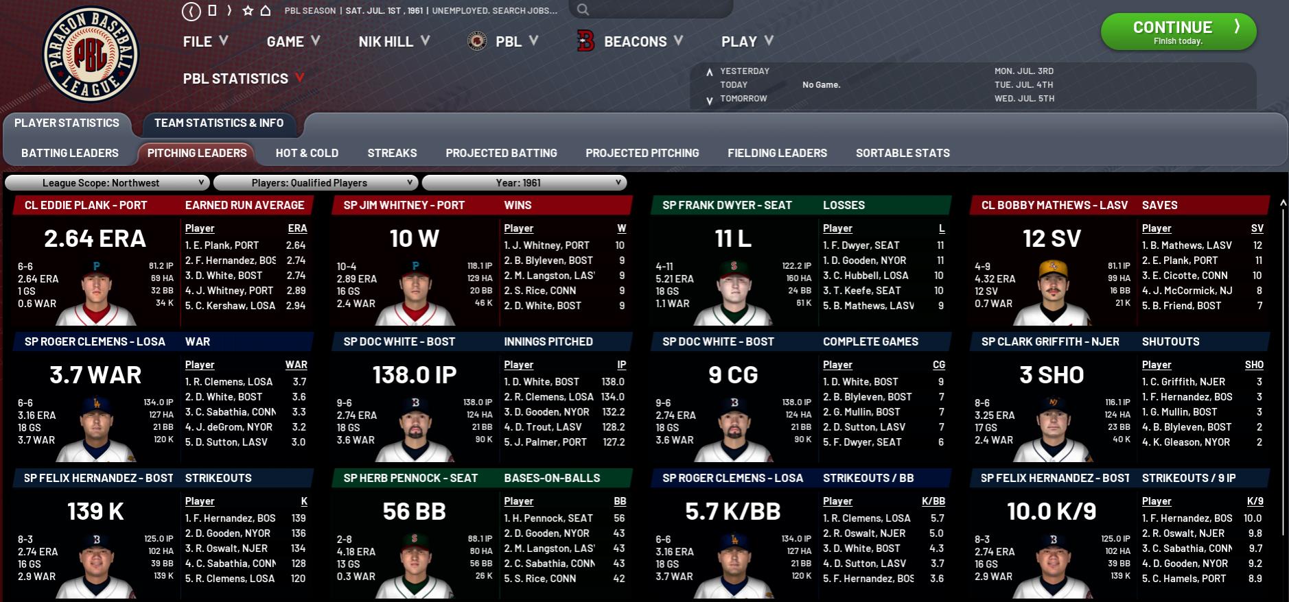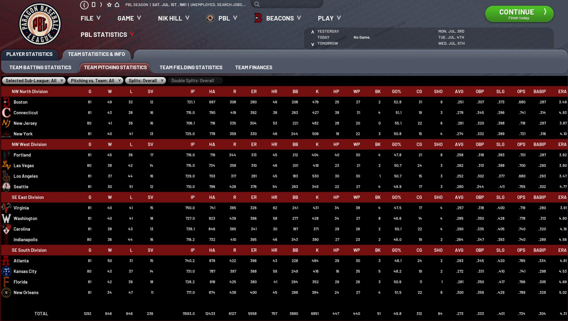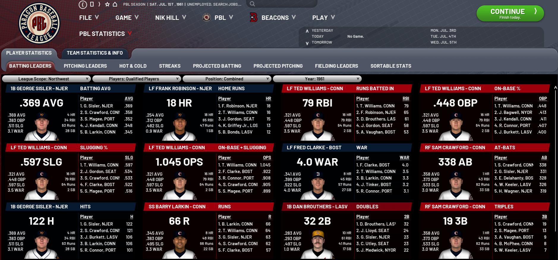 An 18-7 June saw Boston make their move and they now lead the pack by 6. A late surge by the Gothams has at least got them almost back in touch with the middle two teams, but with the Beacons at or near the top of almost every stat category they will be tough to haul in, especially if Clarke keeps playing the way he has to this point. West Division For a while there Portland looked ready to run away with it, but a sweep loss to New York in the final series of the month left them with a fairly ordinary 14-11 mark and, more importantly made them look vulnerable for the first time in some time. The others will take heart from that—well, at least the Lizards and Canaries will. Sad to say the Rainiers, at 15 games back and with the league’s worst record by some margin, look unlikely to feature in any stretch action this time around. South Division It all came crashing down in June for Florida, who have fallen to third place after a 9-16 month. Their void was filled by a hot Atlanta unit, who strung together a 19-6 sectional with Reese and Anson running amok, and now lead the division by 6. The Firebirds’ biggest issue is rotation depth: once you get past Joss and Tiant they are eminently gettable, a point I’m sure is not lost on the Blues and Panthers, both of whom will have to get a-movin’ if they want to catch up. The Pirates, it’s safe to say, will be playing more of a spectating role over the remainder. East Division Well I almost got it right. Virginia didn’t overtake Washington, but they’ve caught them and the two are tied at the top of the division with a 40-41 record. What was once the least competitive grouping is now the closest, with the four teams within 3½ games of each other. This one should go right down to the wire.