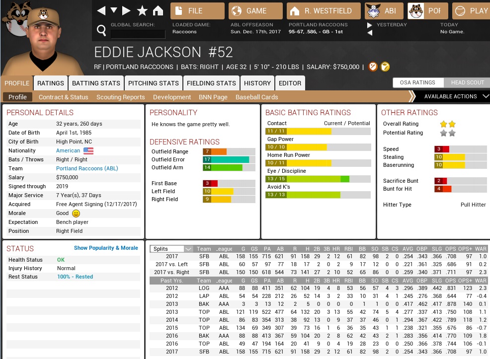 I have not had joy in 25 years. Maud didn’t mind, she was humming and singing and decorating all week before the holidays, which normally also wasn’t her style. I ended up learning from Steve from Accounting that the reason that she wore something other than gray for the first time in a decade was that she was going to have her first date* with an actual* living* man* since ’09. *There are individual past experiences she has that warrant every single one of those asterisks… And bless her, but we had some actual baseball business to conduct ‘round here, and the Raccoons were thoroughly active in December and locked up three new players for the coming season! But please, spare your excitement, Sam McMullen is not gonna be among them. Not by a mile. +++ December 3 – The Miners acquire 32-yr old SP/MR Ed Michaels (55-59, 4.24 ERA) from the Thunder, parting with two prospects, and send two more prospects the Blue Sox’ way for 26-yr old MR Justin Stewart (4-4, 3.98 ERA, 1 SV). None of the four prospects are very special. December 4 – The Rebels add ex-PIT CL Matt Collins (51-30, 2.61 ERA, 157 SV). The 35-year old left-hander will get $4.94M over three years. December 4 – The Loggers get SP Troy McCaskill (44-30, 3.67 ERA) in a trade with the Condors, sending SS/2B Cameron Konrath (.266, 12 HR, 84 RBI) and a prospect to Tijuana. December 4 – The Indians trade LF/CF Josh Baker (.257, 4 HR, 91 RBI) to the Capitals for C Nolan Mancuso (.231, 10 HR, 69 RBI). What looks like a switch of backups does also send promising, but yet unranked pitching prospect Killian Savoie to Indianapolis. December 5 – The Raccoons pick up 27-yr old SS/2B Tim Prince (.266, 11 HR, 114 RBI) in a trade with the Miners, who receive 24-yr old AAA SP Chris Munroe (8-16, 4.52 ERA). December 5 – The Loggers part with their closer Troy Charters (17-22, 4.39 ERA, 70 SV), sending him to the Dallas Stars for two prospects. December 8 – The Warriors strike big in the pitching market, signing ex-VAN SP Sam McMullen (80-63, 3.25 ERA) to a 6-year deal that will earn the 29-year old southpaw $22.64M. December 12 – The Pacifics sign ex-NYC INF Carlos Martinez (.257, 157 HR, 742 RBI) to a 2-year deal that will leave the 34-year old player with $1.88M. December 14 – 34-year old superstar LF/RF Jose “Dingus” Morales (.329, 295 HR, 1,190 RBI), coming off the Warriors’ roster, signs a 2-yr, $7.12M deal with the Cyclones. There are health concerns with Morales, which probably prevented him from getting a longer deal. December 15 – Another ex-Warrior is signed elsewhere, as 1B Stanley Murphy (.288, 292 HR, 1,217 RBI) hooks up with the Gold Sox. The 38-year old first baseman will earn $1.72M for one season of his precious services. December 16 – 35-yr old World Champion 1B Alberto Rodriguez (.294, 132 HR, 972 RBI) is signed by the Scorpions for three years and $8.56M. December 17 – The Raccoons sign ex-SFB LF/RF Eddie Jackson (.267, 58 HR, 388 RBI) to a 2-yr, $1.5M contract. December 17 – After four years in Sacramento and New York, CL Helio Maggessi (56-35, 2.30 ERA, 164 SV) comes home to Indianapolis, having pitched for the Indians from 2006 through 2013. The 33-year old reliever will make a whopping $5.88M over three years. December 20 – Moving inside the CL North, ex-IND C Dave Padilla (.281, 49 HR, 324 RBI) signs with the Canadiens, pocketing $6M over four years. December 20 – The Crusaders also find themselves a new catcher in ex-PIT C Bartholomeu Pino (.266, 246 HR, 1,077 RBI). The 36-year old right-hander will receive $4.66M over three years. December 21 – Former Thunder SP Brian Benjamin (49-61, 4.39 ERA) gets a 3-yr, $2.88M deal from the Stars. December 23 – The Raccoons get pitching help with ex-Loggers SP Ricky Mendoza (107-98, 4.49 ERA). The 34-year old right-hander signs for one year and $450k. December 24 – 32-year old right-hander Tim Winston (90-85, 3.82 ERA), a former Scorpion, joins the Rebels for 2-yr, $2.76M. +++ Signed out of the Greater Hoboken Beer League by the Miners in December 2015, Tim Prince won the Gold Glove at second base and the 2016 FL Rookie of the Year award. He is a bit of an on-base type o’ guy and doesn’t really have any power. He is a right-handed batter, and there would be the possibility to have him start at second base and get Shane Walter to start at first base. Mendoza would start in right, or could even relieve Cookie in center and we move Cookie to right. Also, Tim Prince is happy to be here. This is a bit of a trade that only works out for us if Chris Munroe was really a flash in the pan. If the Miners realign him by bending his appendages into the correct positions, this was one of those all-time terrible trades, because Munroe looked like an actual gold grab in 2016, but couldn’t get anybody out last year. Prince doesn’t make the lineup better, except against left-handed pitching, where he makes it less one-dimensional and less prone to complete chokes. This was at the winter meetings, with several other useful players that were either veterans who knew they weren’t getting a 6-year deal, or in one case a certified playoff dream killer, that the Raccoons were still after. None of them was batting left-handed. We had well enough left-handed bats, we needed more right-handed hitting. I was after a number of free agents and we offered more or less every penny that was available at the time, bidding on five players total. One of those was 35-year old Clay Messer, who was able to competently man almost every corner position and was a right-handed batter, but we actually ran out of money and were out-bid by the Gold Sox for his services. Not that this was the end of the world. We’re talking about players that were on six teams in six years and that are willing to sign for $300k in December. Not from that mold was Eddie Jackson, who had played a big part in beating the Critters in the CLCS in October. He was exactly the meaningful, right