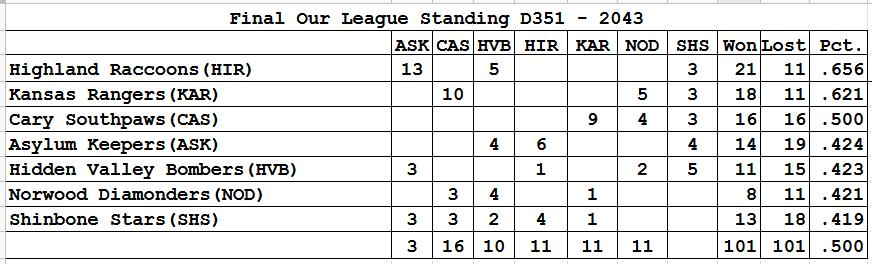 Although no competition against any other Our League teams, the El-Dorado Aztecs are headed to the playoffs after winning the AC East Division with the second best record in the league. The Aztecs have a 12 game winning streak. Everyone massacred the poor Waco Legends (3-159).