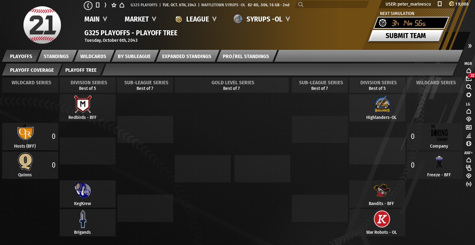 Weston Pointe stepped up to the task in the stretch run and emerged as the OL Gold champs in a tight race. Overall, Brigadoon nabbed the top seed in the NC with an impressive 100-62 season. And in a case of poor timing for a losing streak, Port Ruppert dropped 10 straight games in the final two weeks (including 5 losses to Krikkit), and ended up in a tie for the NC West division lead with Krikkit (who won 6 straight to help their own cause). In the tie-breaker, Krikkit won their 7th straight and sniped the division title. With 4 promotion spots, the possibility of 2 OL promotions to Diamond is on the table if both Brigadoon and Krikkit can win their series. Relegations to Silver: Coney Island, Ewa Beach, Annandale, K-Town, Terra Incognita (rough season for OL). |