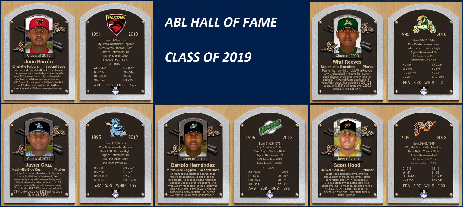 With 87.3% of the vote and the highest in the voting process, CL Scott Hood (67-56, 2.07 ERA, 427 SV) was inducted into the Hall as a Gold Sock. Picked a modest 79th in the Amateur Draft, Hood made his debut for the Gold Sox in 1999 and wrestled his way into the closer’s role by 2001, continuing to pitch for the Gold Sox for six more years, becoming Reliever of the Year in 2004, before joining the Crusaders as a free agent for 2007 just in time for their first 3-peat to award him with the only three rings he won in his career. Hood was an All Star five times and led the league in saves twice, ending his career with the Titans in 2013. Drafted in the fifth round of the 1990 draft by the Crusaders, it took a while for SP Javier Cruz (256-177, 3.78 ERA, 1 SV) to see his star rise. It took him five years and getting released by the team that drafted him, after which he hooked up with the Blue Sox, to reach the major leagues, which he then conquered in a real hurry. After leading the league in losses in his first full season in ’96, he would lead the league in wins the next two years, and took home Pitcher of the Year honors in both years. He also led the FL in ERA in ’97, missing the triple crown by eight strikeouts compared to SAC David Castillo. He settled into consistency mode after that, posting ERA’s in the 3-range in all but four of his last 14 seasons. He would win 20 games a third time in ’02, pitching for the consistently decent, but not good enough Blue Sox through 2006 before alighting on the long-sunk Raccoons’ ship on a free agent deal in 2007. Spending three more years with them and then two in Cincinnati before retiring after the 2019 season. In an 18-year career that saw him strike out 3,164 batters, he posted a losing record only four times, and he still ranks in the career top 10 in both wins (8th) and strikeouts (9th). While Bartolo Hernandez debuted with the Loggers as a 20-year old in 1995 after being drafted #3 overall in 1993, he didn’t break out until 1997, quickly becoming part of group of players that helped the Loggers be relevant for the only not-quite-decade of their existence. Hernandez was an elite contact hitter that piled up 2,849 base knocks in his career, of which less than 500 went extra bases. He made up for that with his feet, stealing 344 bases in his career, and leading the league in steals once while leading in hits three times. The 3-time All Star, who also won five Gold Gloves in his career, stuck with the Loggers for 15 years total before finishing out his career with five teams in the last four years. A player of remarkable consistency, Hernandez hit .310 or better nine times, and .290 or better 13 times in his career, with a high water mark of .353 in the 2005 season, but never won a batting title. He is the second player of the Loggers’ semi-dynasty to be enshrined in the Hall, joining Martin Garcia, and he is the only player to connect for six base hits in an ABL game twice, having both big days as a Logger. Whit Reeves (209-124, 3.38 ERA) from the Sunfish Capital of the World, Onalaska, Wisconsin, split his 16 year-career equally between the Scorpions and Crusaders, but chose to be inducted with the insignia of the team that drafted him 10th overall and had him debut as a 20-year old in the 1995 season. The right-handed Reeves was the FL Pitcher of the Year in 2000 and was an All Star five times, but led the league in a major category only once, posting the best FL ERA in his POTY season in which he also won a career-high 19 games. Joining the Crusaders as free agent for the 2003 season, Reeves initially posted two losing seasons before catching fire again. He also won three rings like Scott Hood, participating in the Crusaders’ 2007-09 3-peat before retiring after a partial 2010 season. Switch-hitting middle infielder Juan Barrón (.303, 35 HR, 950 RBI) played for more teams than any other of the inductees after making his major league debut as a tender 18-year old all the way back in 1991 with the Falcons, batting .289 in 44 games for them. Although the #6 pick in the 1990 draft never led the league in anything else than in doubles in 1994 (but hitting a whoppin’ 60 of them that season), his high-average, high-OBP presence at the plate, coupled with strong defense that would yield four Gold Gloves for him eventually, and – in his early years – a propensity to steal 20+ bases, made him a much vaunted top-of-the-order batter. He spent his first 16 seasons all in the CL South, playing for the Condors and Bayhawks after his Falcons stint ended after the 1998 season, before signing with the Stars prior to the 2007 season, but he would be traded twice over the course of the 2-year contract, first to the Capitals in mid-season of ’07, and then to the Raccoons the following winter. He played two seasons as a backup with the Indians before retiring after the 2010 season. Barrón chose to be inducted with the Falcons, his first team and the one he spent the most time with. +++ Complete voting results: DEN CL Scott Hood – 1st – 87.3 – INDUCTED NAS SP Javier Cruz – 2nd – 86.6 – INDUCTED MIL 2B Bartolo Hernandez – 1st – 79.0 – INDUCTED SAC SP Whit Reeves – 4th – 77.0 – INDUCTED CHA 2B Juan Barrón – 4th – 76.3 – INDUCTED ??? SP Chris York – 1st – 58.8 ??? LF Bakile Hiwalani – 2nd – 42.3 SFB CL William Henderson – 8th – 23.0 ??? CF Jerry Fletcher – 2nd – 22.7 BOS CL John Bennett – 1st – 11.7 BOS 3B Mark Austin – 1st – 9.3 SFW 2B Dave Heffer – 1st – 8.6 NYC SP Anibal Sandoval – 5th – 7.2 IND SS Ramón Garza – 1st – 6.5 PIT SP Henry Becker – 1st – 3.8 – DROPPED NAS CL Jose Escobar – 2nd – 3.8 – DROPPED OCT 2B Bruce Boyle – 1st – 3.4 – DROPPED IND 3B David Lopez – 4th – 2.7 – DROPPED PIT CL Paco Barrera – 2nd – 2.4 – DROPPED BOS RF Gonzalo Munoz – 1st – 1.4 – DROPPED NAS SP Dave Crawford – 1st – 1.0 – DROPPED BOS MR Ramiro Rom