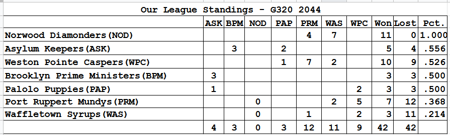 Thought I'd do a quick Iron update. If I got all of the games, then as of end of play yesterday it's close. We were all within 2 games of .500, and no one is breaking out of the pack yet.