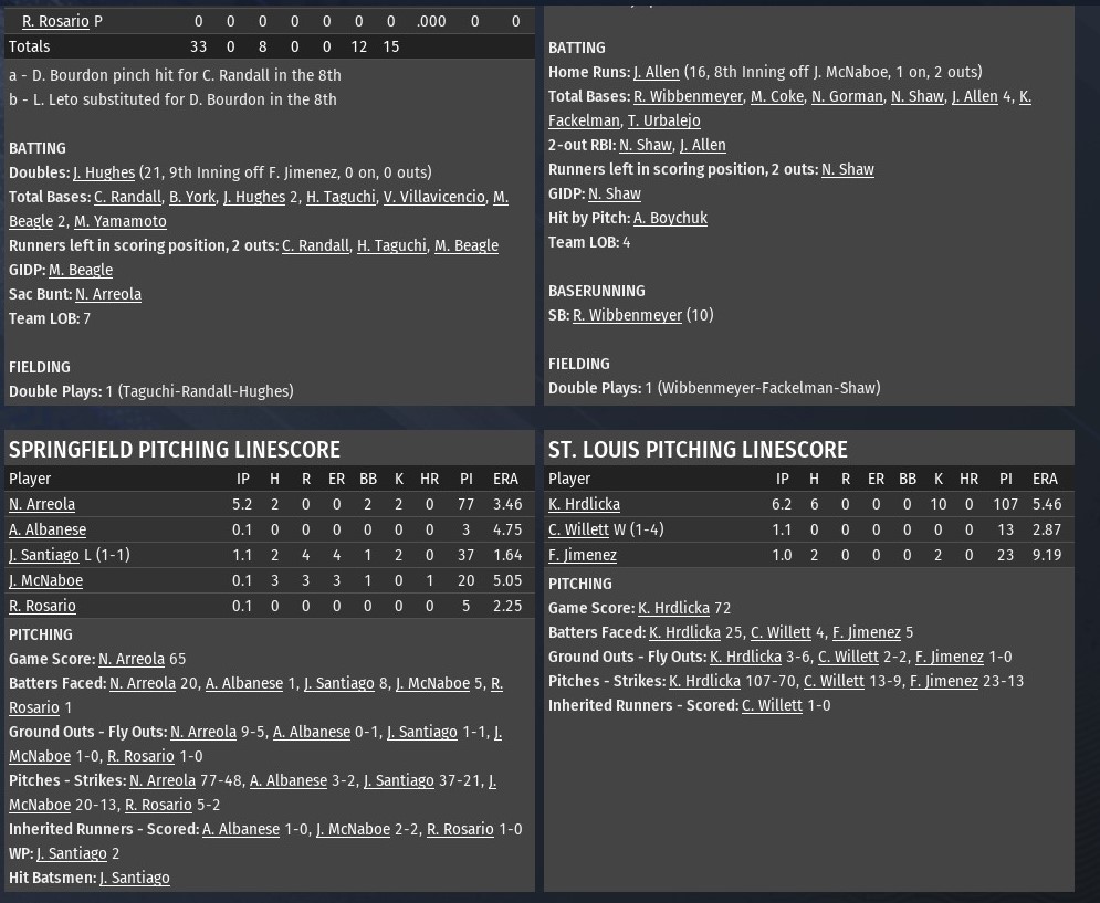 Nick Shaw led off the bottom of the 10th inning with a walk-off home run as St. Louis defeated Springfield 3-2 at Busch Stadium (2006). The win gave the River Walkers a sweep of the three-game series and victories in five of six games in the home and home. Shaw's homer came on a 3-2 pitch from Railers relief pitcher Ron Tanner. It carried 358 feet over the right-field wall. The game had been tied 2-2 since the bottom of the sixth when St. Louis' Manuel Coke hit his 23rd homer of the season, a solo shot, off Springfield starter Pascal Marcovicci. A solo homer from Joseph Hughes off St. Louis starter Xavier Wigfall in the top of the fifth had put Springfield ahead 2-0. Joe Allen drew a walk to lead off the bottom of the fifth for St. Louis. He stole second and moved onto third on a throwing error by catcher Matt Beagle. Allen scored on a Mike Vaughan ground out making it 2-1. Wigfall pitched 6.1 innings, allowing two runs on eight hits. He struck out eight and walked two. McVey and Carlos Hernandez both got one out to end the seventh. Alex Rios (0.2 IP) and Leo Hermosillo (0.1) combined on a scoreless eighth. Closer Craig Fritzler (2-2) handled two innings without allowing a run and earned the win. |