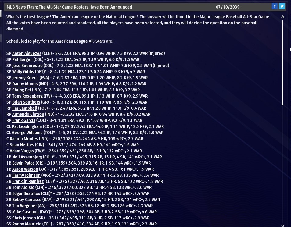 Selected to the team were right fielder Manuel Coke, outfielder Joe Allen and starting pitcher Ming Xiang. Closer Craig Fritzler was selected to the NL roster through the fan vote. * Coke, 26, has been selected to his third All-Star team. The 2038 NL Most Valuable Player is having another outstanding season batting .294 with 23 homers and a league-leading 78 RBIs in 85 games/81 starts. * Allen, 34, is now a four-time All-Star. Signed as a free agent by the Walkers on April 19, Allen has hit .259 with 17 homers and 51 RBIs in 68 games/65 starts. * Xiang, 27, a two-time All-Star in just his third MBL season, the right-hander is 8-5 in 18 starts with a 2.66 ERA. He has pitched a total of 122.0 innings, during which he has struck out 88 and posted a 1.04 WHIP. * Fritzler, 32, has made his sixth All-Star team. It hasn't been the best of seasons for the veteran closer although he has pitched better the last few weeks. In 28 appearances, Fritzler is 2-2 with 13 saves and a 3.68 ERA. He has pitched 29.1 innings, during which he has struck out 36 and posted a 1.33 WHIP. He has seven blown saves. |
