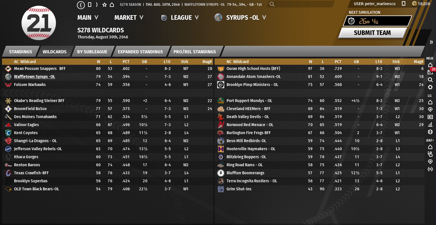 Annadale remains the lone OL team heading to the LCS as Port Ruppert wins their WC match but falls to the top seed in the LDS; while Waffletown chokes something fierce getting swept by a team they beat 13 of 19 in the regular season (no, I'm not bitter or anything )heading back in time to v20 to watch a Waffletown team that can actually play (heading to the Perfect tier LCS there) |