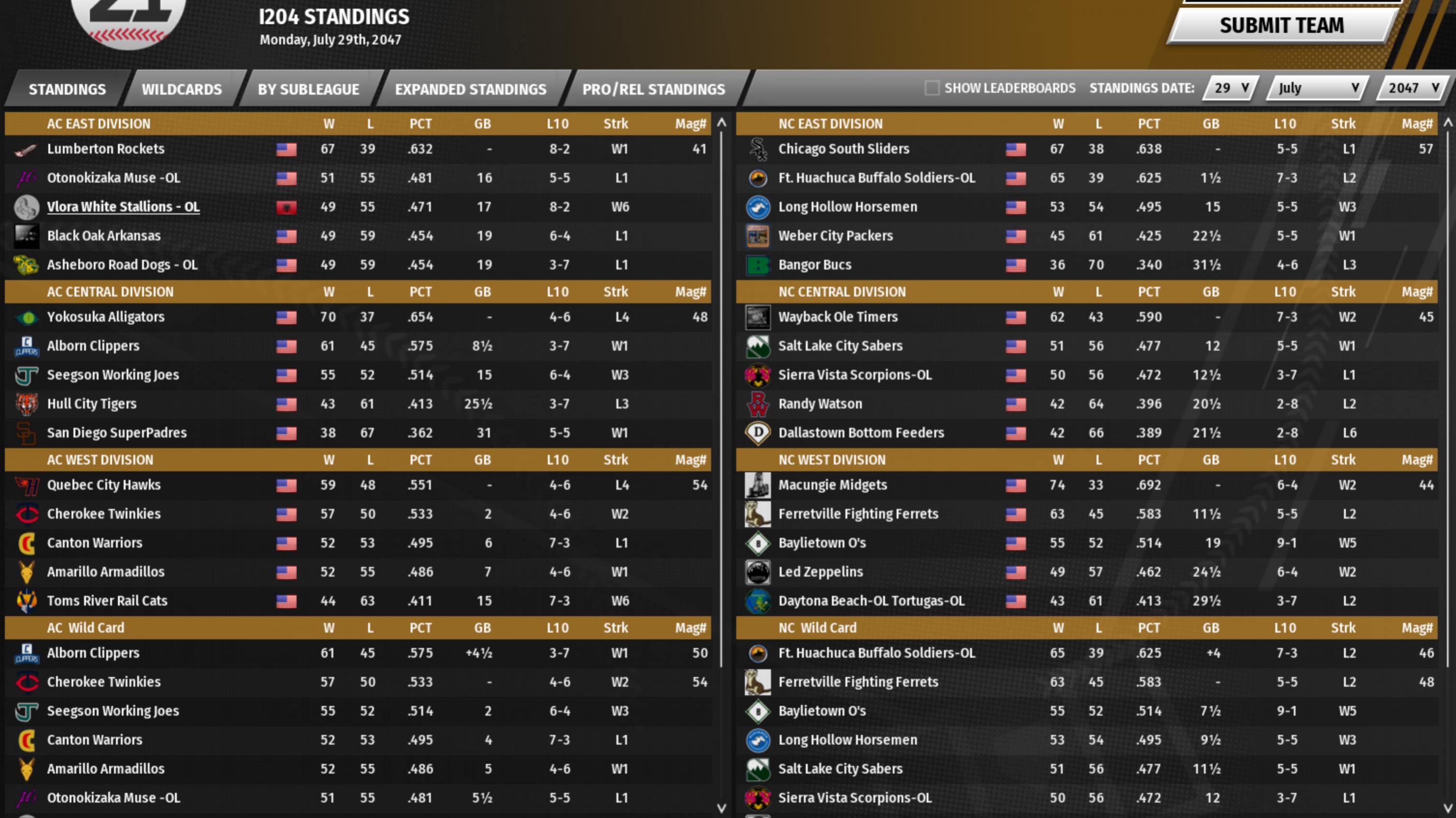 The path to the crown: If El Dorado sweeps Death Valley, Shangri-La would need to post a 12-2 record to take the title. Shangri-La would have to go 10-4 if El Dorado takes 2 of 3 Brooklyn with a sweep of Ewa Beach in their final 3 OL games is the only other team in contention. If El Dorado loses 2 of 3 and Shangri-La posts a record of 8-6 or less Brooklyn would take the crown. If El Dorado gets swept Shangri-La wins the crown with by going at least 8-6 unless Brooklyn gets the above mentioned sweep. In that case Shangri-La needs 10 wins. PT Standings below. Both leagues have quite the WC races going on. El Dorado can challenge for the division in the AC while Ewa Beach leads its division in the NC. Shangri-La while battling to win a crown will be battling to get out of the relegation zone along with Death Valley. |